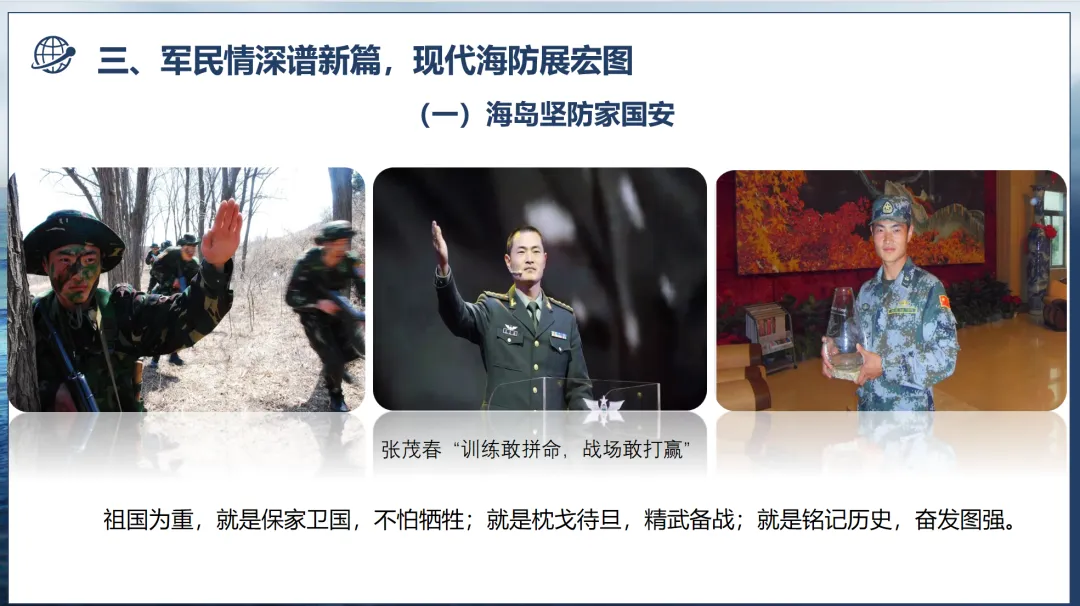 “海岛为家、艰苦为荣、祖国为重、奉献为本”,以王明海为代表的驻岛官兵,用青春与坚守践行着“老海岛精神”。《战士的第二个故乡》《爱在大钦岛》等文化作品,将他们扎根海岛、守护家国的赤诚传递到千家万户;这份“军民同心”的信念,正是对近代海防“图强初心”的最好传承。