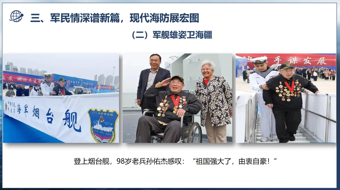 潮涌海疆处,烟台海防的现代化实力愈发凸显——烟台舰等现代化舰艇列阵海疆,尽显大国重器的磅礴气势;烟台籍海员登舰致敬、98岁老兵亲临见证并感慨“祖国强大”,一幕幕动人场景,勾勒出人民海军“从无到有、从小到大、从弱到强”的跨越。这支强大的现代化海军,既是建设世界一流军队、筑牢海洋强国的核心力量,也让烟台“胶东堡垒”的底色愈发坚实。