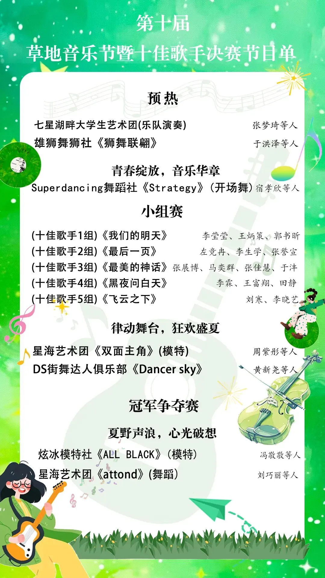 草地音乐节,是才华的狂热碰撞,是激情的彻底释放!当音符在空气中激情跳跃,当歌声在夜空中热烈回荡,我们用音符勾勒梦想,用乐谱传递力量。让我们一起期待这场音乐狂欢,见证校园十佳歌手的诞生吧。