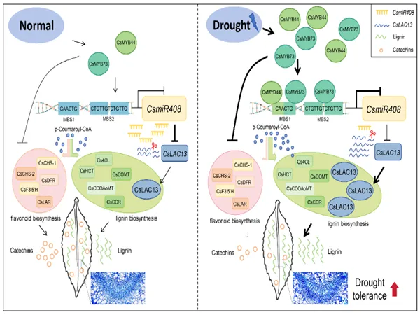 研究发现,干旱胁迫下CsmiR408表达水平显著降低,其变化趋势与木质素含量变化显著负相关。过表达CsmiR408降低了茶树叶片的木质素含量,并削弱了茶树的抗旱能力。CsLAC13作为CsmiR408的靶基因,其促进木质素的积累以增强茶树的抗旱能力。另外,CsMYB44和CsMYB73被干旱胁迫诱导表达,并抑制CsmiR408的表达。过表达CsMYB44/73均能够促进木质素的生物合成,并提高茶树的抗旱能力。此外,CsMYB44/73还通过负调控类黄酮生物合成途径相关基因的表达,减少儿茶素的积累,从而使p-Coumaroyl-CoA更多的流向木质素生物合成途径,间接增加了木质素的积累。