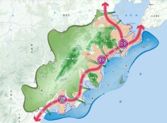 一核三区:以自贸试验区联动拓展区为核心,着力构建唐岛湾金融科创区、海洋高新产业集聚区、董家口新港城三个动力源。