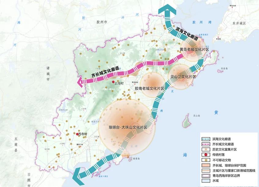“四区”以文化关联性和空间集聚为基础,形成“黄岛老城文化片区、灵山卫文化片区、胶南老城文化片区、琅琊台-大珠山文化片区”等四个文化展示片区。