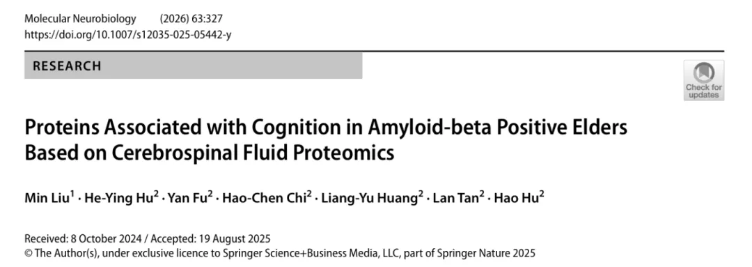 近日,青岛市市立医院神经内科谭兰、胡浩教授团队在Molecular Neurobiology上发表了题为“Proteins Associated with Cognition in Amyloid-beta Positive Elders Based on Cerebrospinal Fluid Proteomics”的论著文章。大连医科大学刘敏为论文第一作者,青岛市市立医院胡浩和谭兰为共同通讯作者。该研究通过对6,361种脑脊液蛋白的大规模筛选,识别出与A+人群认知功能显著相关的关键蛋白,为解析从淀粉样蛋白沉积到认知障碍转变的机制提供了新的视角。(拓展阅读:谭兰课题组相关研究进展,详见“逻辑神经科学”报道(点击阅读):JAD︱青岛市市立医院谭兰/徐伟报道“抑郁相关动态特征”预测全因痴呆和阿尔茨海默病风险:两个独立队列和纵向研究证据荟萃;Transl Psychiatry︱青岛市市立医院谭兰/徐伟团队基于外周血脂肪酸谱系构建评分预测阿尔茨海默病风险并探讨其机制;Transl Psychiatry | 青岛市市立医院王作腾/谭梦姗/谭兰/郭帆首次探究补体C1q、神经炎症和AD病理的关联;JNC|青岛市市立医院谭兰/胡浩/谭梦姗团队利用新型影像标记物揭开脑小血管病早期病理改变;Transl Psychiatry︱青岛市市立医院王作腾/谭兰/郭海华首次探究睡眠质量、血浆神经丝轻链和认知功能的关联;JAD︱青岛市市立医院徐伟/谭兰/于海红建立首个轻度认知障碍认知损害逆转的预测模型;BMC Med︱循证医学历数男性和女性特异性痴呆风险因素;JNNP︱徐伟团队构建“主观认知减退”群体发生认知减退或痴呆的预测因素谱系)