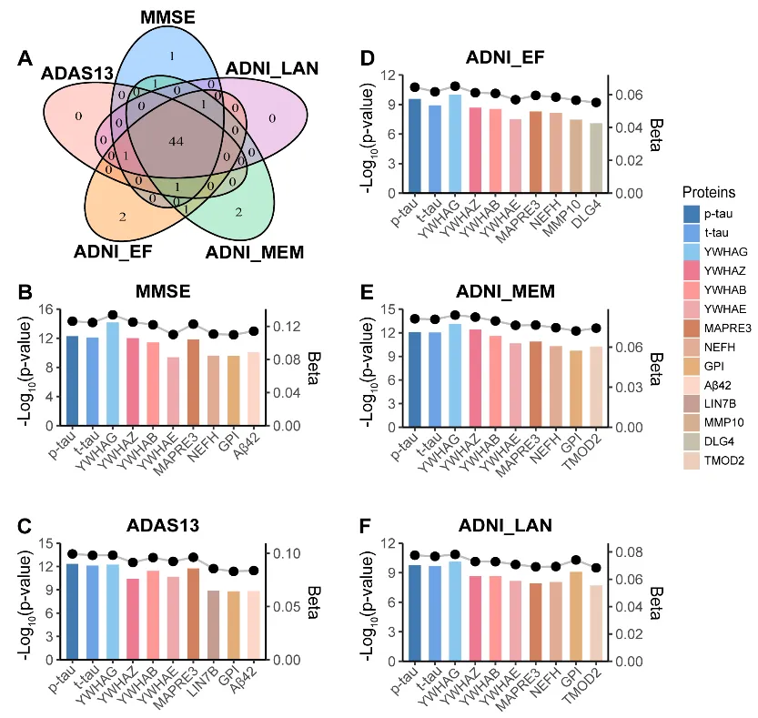 在随后的纵向研究中,发现上述失调蛋白中有44种与五项认知量表(MMSE、ADAS13、ADNI_EF、ADNI_MEM 和 ADNI_LAN)评分的变化均表现出统计学关联。在关联最显著的前10种蛋白中,有7种蛋白质在所有认知量表中均呈现出高度一致性,分别为:p-tau、t-tau、YWHAG、YWHAZ、14-3-3 protein beta/alpha (YWHAB)、14-3-3 protein epsilon (YWHAE) 以及微管相关蛋白RP/EB家族成员3 (MAPRE3)(图 2)。进一步亚组分析显示,14-3-3蛋白家族(如YWHAG、YWHAZ、YWHAB)的基线水平与认知量表评分的关联性,在A+T-阶段表现得更为显著。