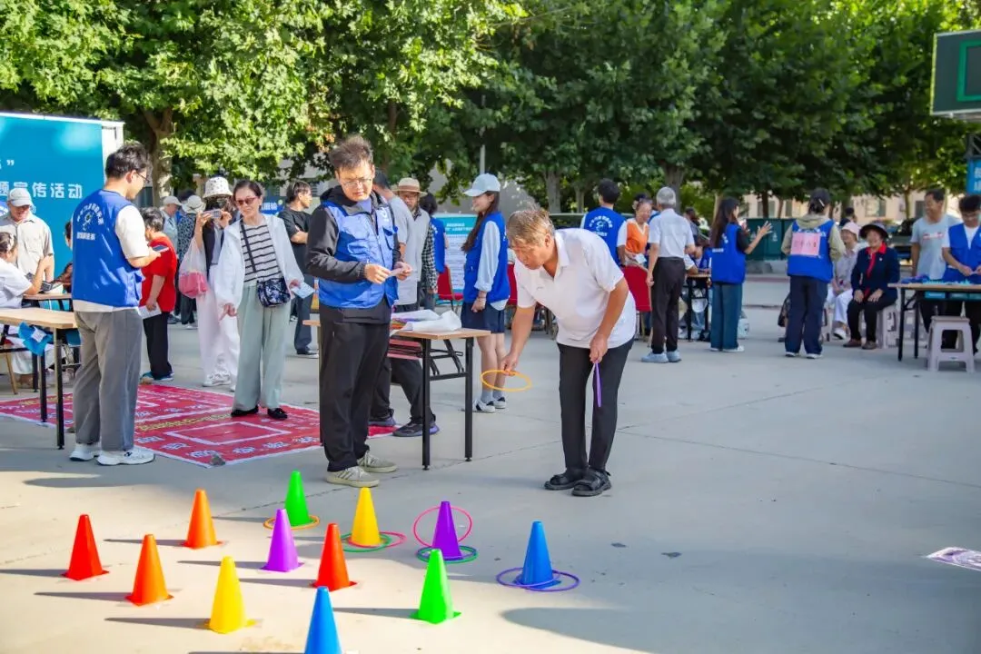活动现场分设三大体验专区,为社区居民带来沉浸式认知健康服务。“认知科普与筛查区”志愿者通过MMSE量表筛查讲解,传递早期干预知识,并带领长辈们练习健脑操,激活身体机能。“认知训练区”开展蒙氏套柱配对和迷宫训练,锻炼长辈的空间认知、逻辑思维与专注力。“互动体验区”则设置精准配对、快乐足球、套圈、数独等五项趣味游戏,在轻松互动中训练分类记忆、平衡协调等多维能力。义诊区专业医生耐心提供血压测量与健康咨询,为老年人答疑解惑。各区域均采用打卡集章方式,增强参与感与成就感,现场氛围温馨而热烈。