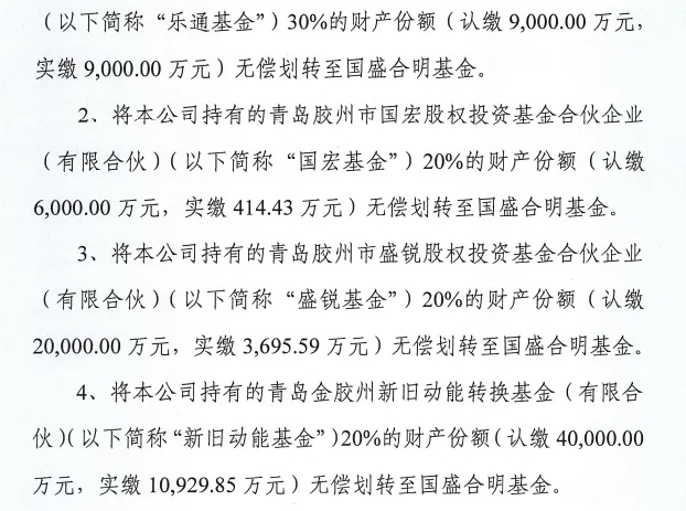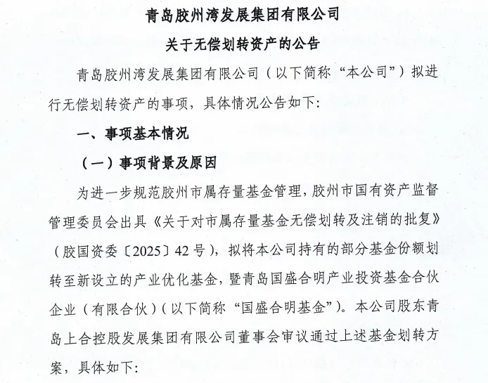 日前,青岛胶州湾发展集团有限公司发布一则无偿划转资产的公告。公告称,为进一步规范胶州市属存量基金管理,拟将青岛胶州湾发展集团持有的部分基金份额划转至新设立的产业优化基金,暨青岛国盛合明产业投资基金合伙企业(有限合伙)(以下简称:国盛合明基金)。