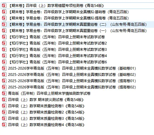 本合集收录了2023-2026学年青岛版五四制四年级数学上学期期末试卷共13套,涵盖基础卷、提高卷、质量检测卷等多种类型,全面体现课程标准要求。