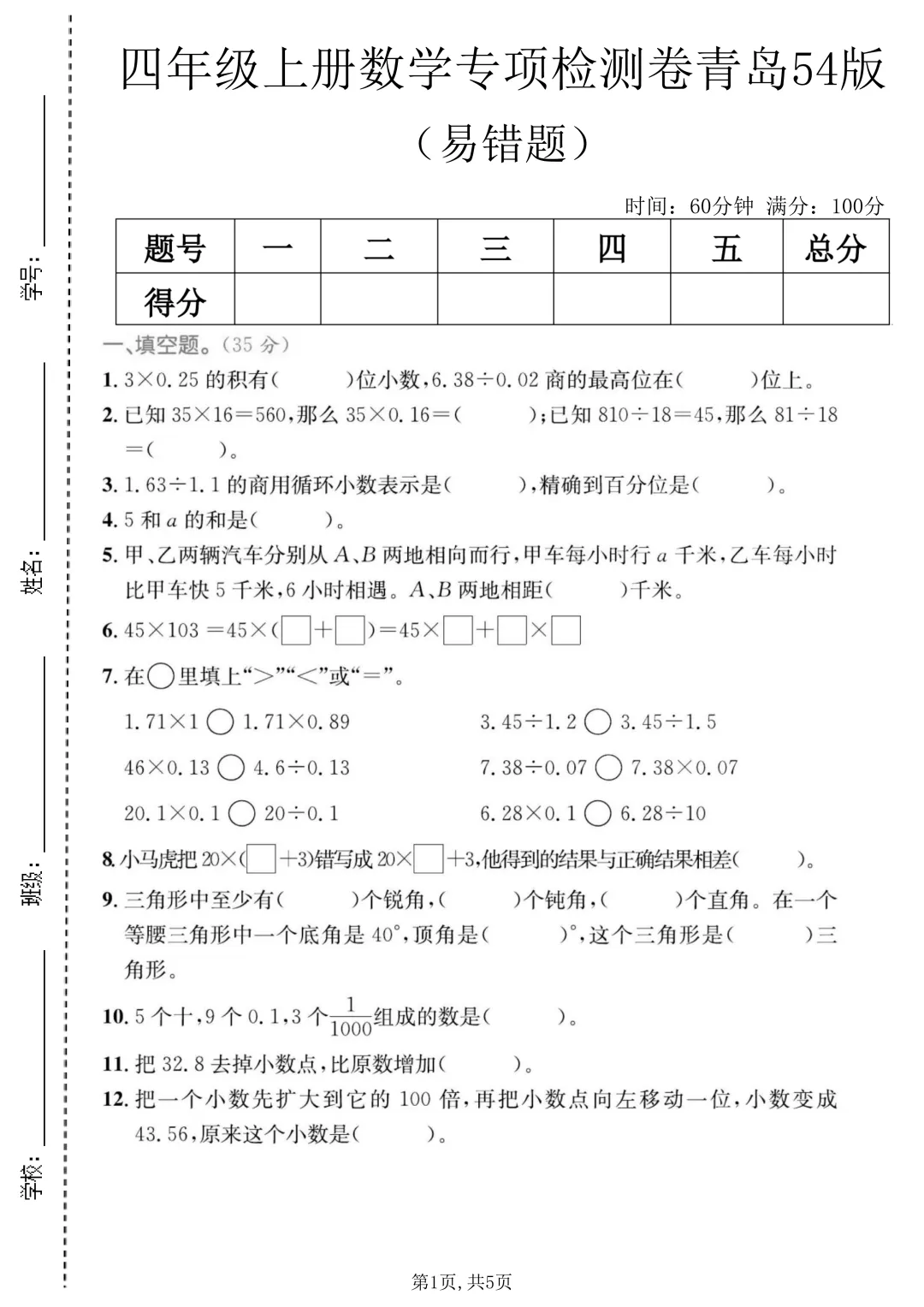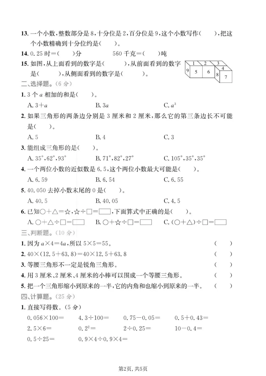 核心内容:小数加减法、三角形特性、简单代数式