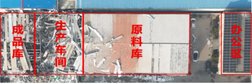 事故厂房为单层钢结构建筑,由出租人于某波于2024年3月翻建,面积约1100 平方米。租赁厂房后,仟佰味公司使用彩钢板等材料对租用厂房进行分隔、改造,分区为原料库、生产车间和成品库,爆炸发生在生产车间(约300平方米)。