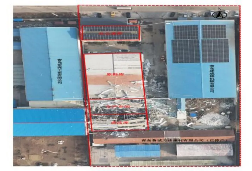 仟佰味公司与青岛凌成锋机械有限公司、青岛鲁诚万佳建材有限公司(已停产)位于同一院落内,仟佰味公司与青岛凌成锋机械有限公司车间东西相邻,厂房被院内道路自然分割。仟佰味公司与青岛鲁诚万佳建材有限公司南北相邻。西侧与青岛世亮工贸有限公司一墙之隔。北侧与合租办公楼隔路相邻。企业周边环境见图 2。