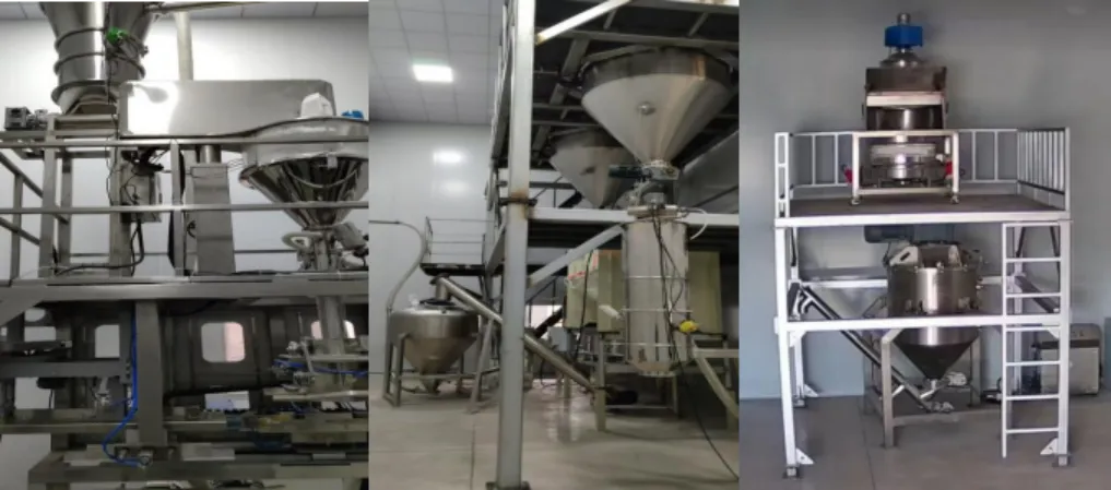 生产车间主要生产设备有:卧式混合设备和立式混合设备各1 套,TYR-200 半自动粉体包装机 1 台,分别位于生产车间相邻隔间内。生产车间内的生产设备中,除了卧式混合设备的混合机和振动筛有明确的生产厂家和设备型号外,其余设备均未见采购合同、设备图纸资料、设备生产厂家和设备铭牌等。