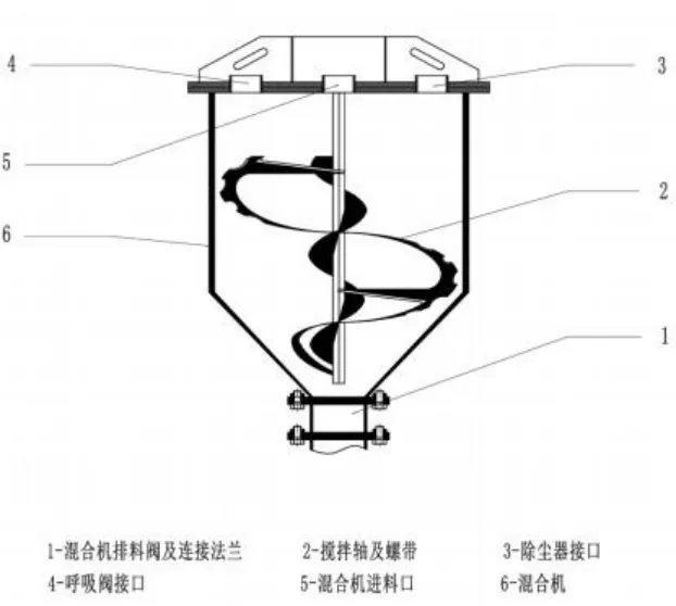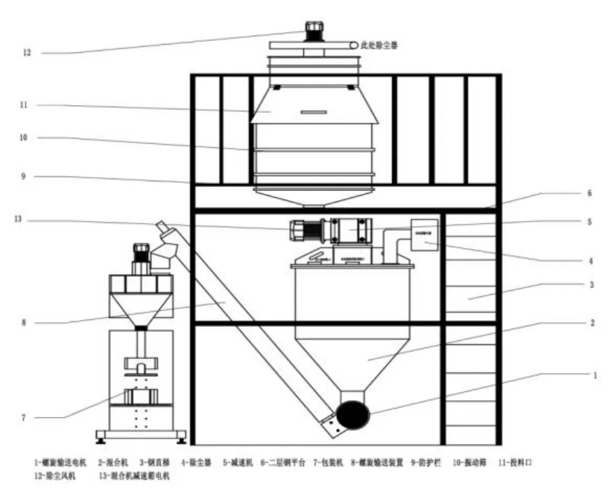 立式混合生产设备,自上而下分别为带除尘功能和振动筛的投料机、立式螺带混合机、单管上料机,之后是人工称量、包装。投料机放臵在约3m 高的平台上,叉车将物料运送到平台后,人工投料。投料机底部的振动筛与位于平台下部的混合机通过软管连接,物料通过软管从投料机进入到混合机。混合机底部通过排料阀后与单管上料机连接,实现排料。