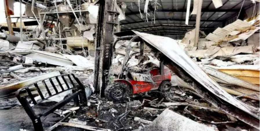 2. 混合机及相关设备爆炸后状态。混合机罐体被爆炸撕碎为多个残片,有残片上有明显金属摩擦痕迹,并有变色迹象。整个罐体仅有检修门较完整。罐盖挣脱紧固螺栓,连同传动齿轮、转动轴(整体重量 354kg),飞越西侧高为 4.2 m 的墙落入青岛世亮工贸有限公司的厂房内;单管上料机被炸飞至成品库外过道里,距爆炸点16.7m。排料阀飞至爆炸点5.7m东南侧的成品库内。投料用叉车被炸报废(图 11 )。TYR-200半自动粉体包装机被整体推到在西侧车间墙上。