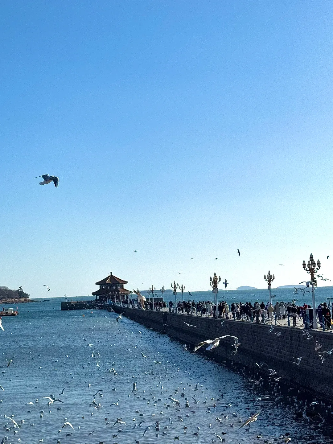 栈桥建在清末,是军港码头,后成城市名片,桥头的小青岛有座灯塔,早年给船领路,夜里白光一闪一闪,很稳。