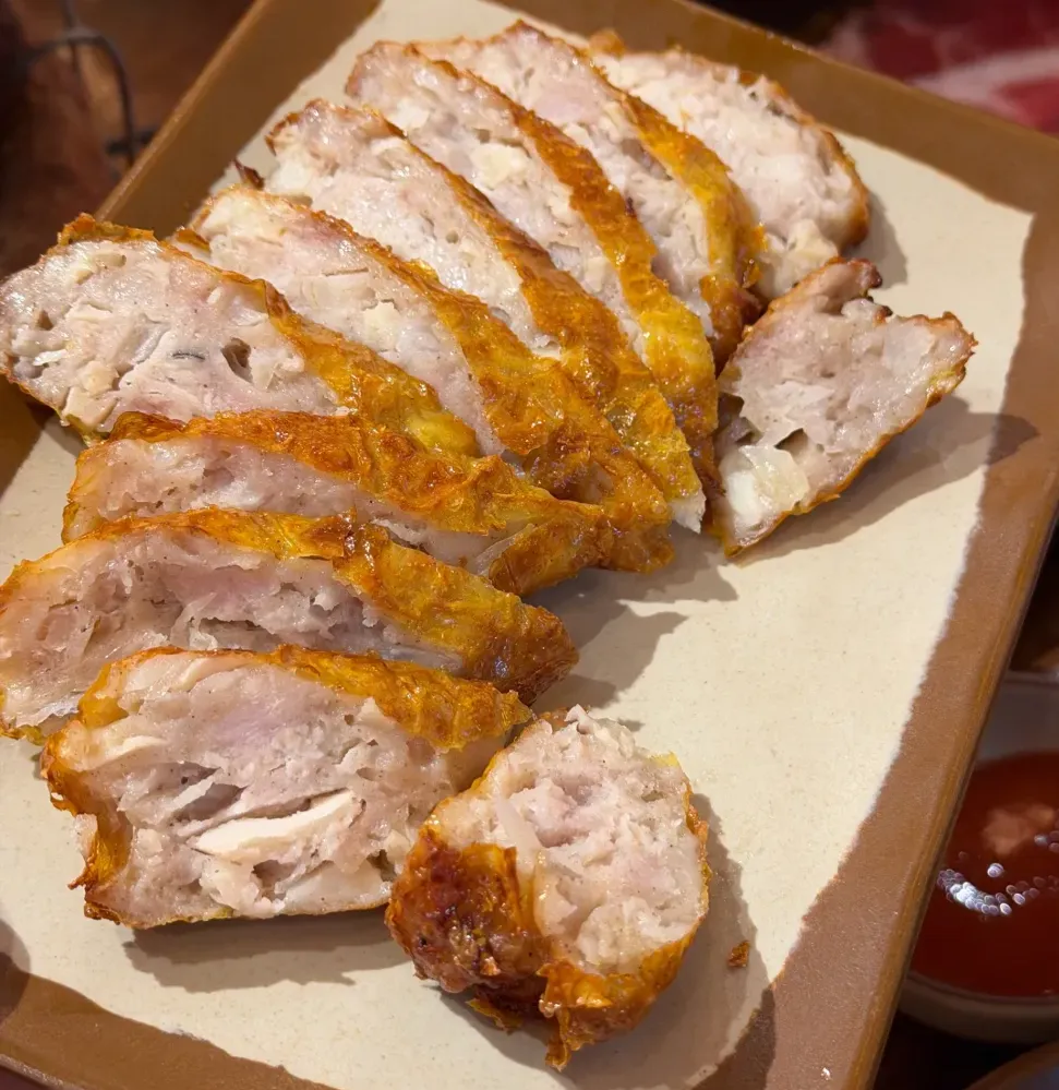 厦门五香卷:蛋皮炸得金棕透亮,边边角角带着点焦脆的褶子,切得厚薄均匀的片儿,露着里面粉白的肉馅,还能瞅见碎马蹄和葱花的白绿碎末。先捏起一片,蛋皮 “咔嚓” 一声脆响,咬开是焦香裹着软嫩 ,蛋皮脆得掉渣,裹着的肉馅儿是紧实挂汁的那种,不是干柴的死面疙瘩,嚼起来能尝到马蹄的脆甜,混着猪肉的香,还有点葱花的清劲儿,咸淡刚好卡在舒服的点儿上。