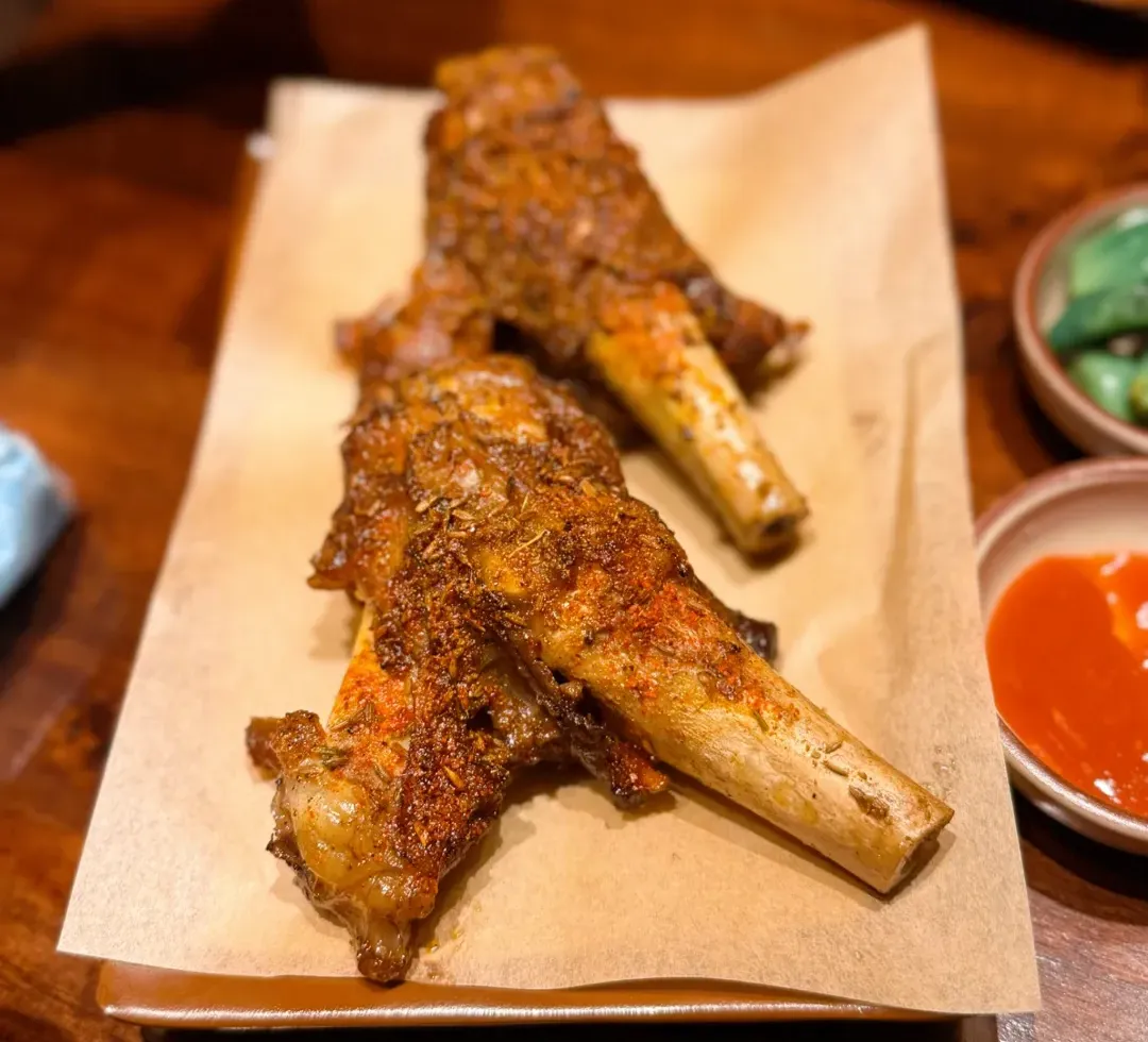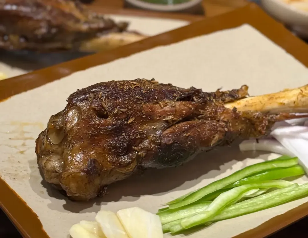 烤羊小腿:表皮烤得棕褐发亮,油光裹着细碎的孜然、辣椒面儿,边边角角带点焦脆的黑壳,顺着骨棒摆得敦实,还有脆生的青椒条和蒜片,看着就够劲儿。外层皮脆得咬开带响,焦香裹着孜然的麻香先钻满嘴;里头的肉是嫩的,还挂着点油汁儿,肥的部分烤得酥香不腻,瘦的地方嫩得能掐出鲜味儿,连筋带肉嚼起来,孜然的香、羊肉的鲜、焦皮的脆裹在一块儿,越嚼越香,半点膻味都没有。