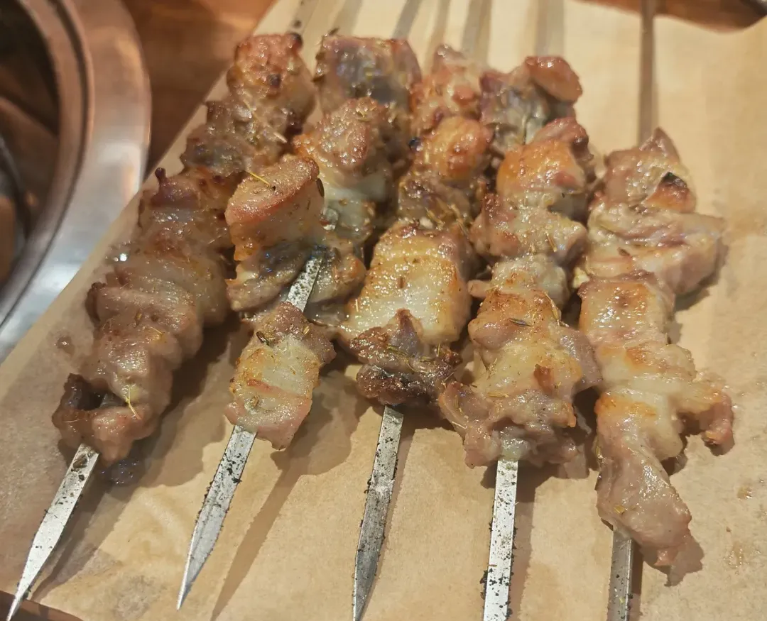 烤羊肉串:肉块是肥瘦相间的,肥的那层烤得泛着油光,边缘带点焦褐色的脆壳,瘦的部分是嫩粉色裹着焦边,表面还沾着细碎的香料碎,油珠子顺着肉缝往下渗。轻咬一口,肥瘦那块直接在嘴里爆汁!肥油是焦香的,一点不腻,瘦的部分嫩得很,咬开能觉出羊肉本身的鲜,混着迷迭香那点特殊的香,越嚼越香。再啃块带筋的,筋头是韧的,裹着肉香越嚼越出味儿。