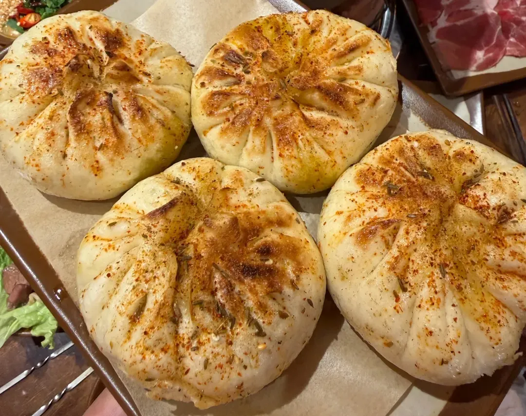烤羊肉包子:咬开个小口,先冒出来的是热乎的肉汁儿,裹着孜然香,顺着嘴角往下淌,得赶紧吸一口。接着咬开皮,烤过的边儿焦脆带点韧劲儿,内里的皮却软乎乎的,裹着满当当的羊肉馅:肉是剁得细碎的羔羊肉,混着点洋葱碎解腻,咬开是咸香裹着孜然辣,肉嫩得不用嚼就化开,油润却不腻。