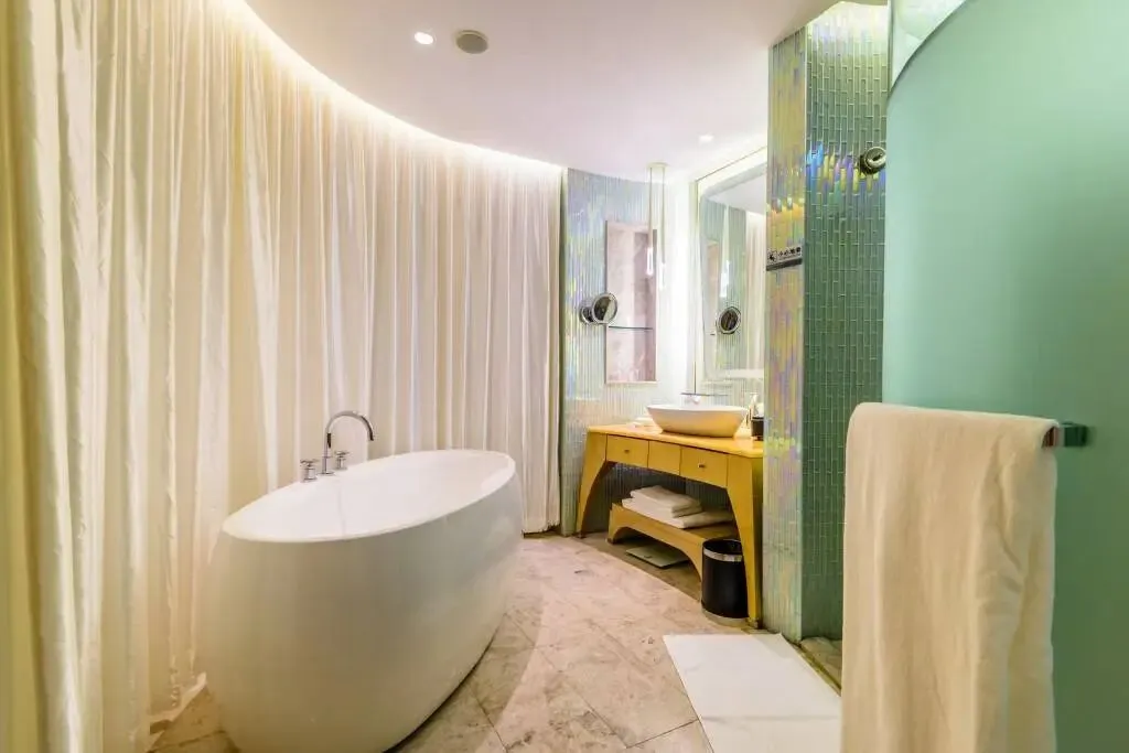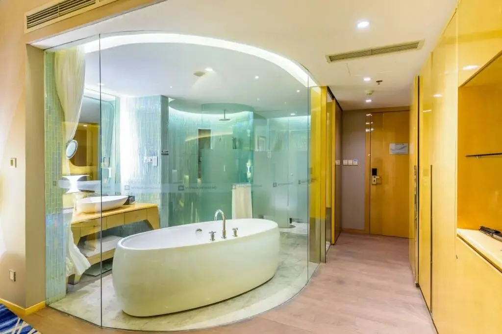 浴室设计得很有新意,像一个小小水族馆,淡蓝的海水在碧波微漾,身在其中像一尾自由自在的鱼,大浴缸轻松泡走旅途中的疲倦。