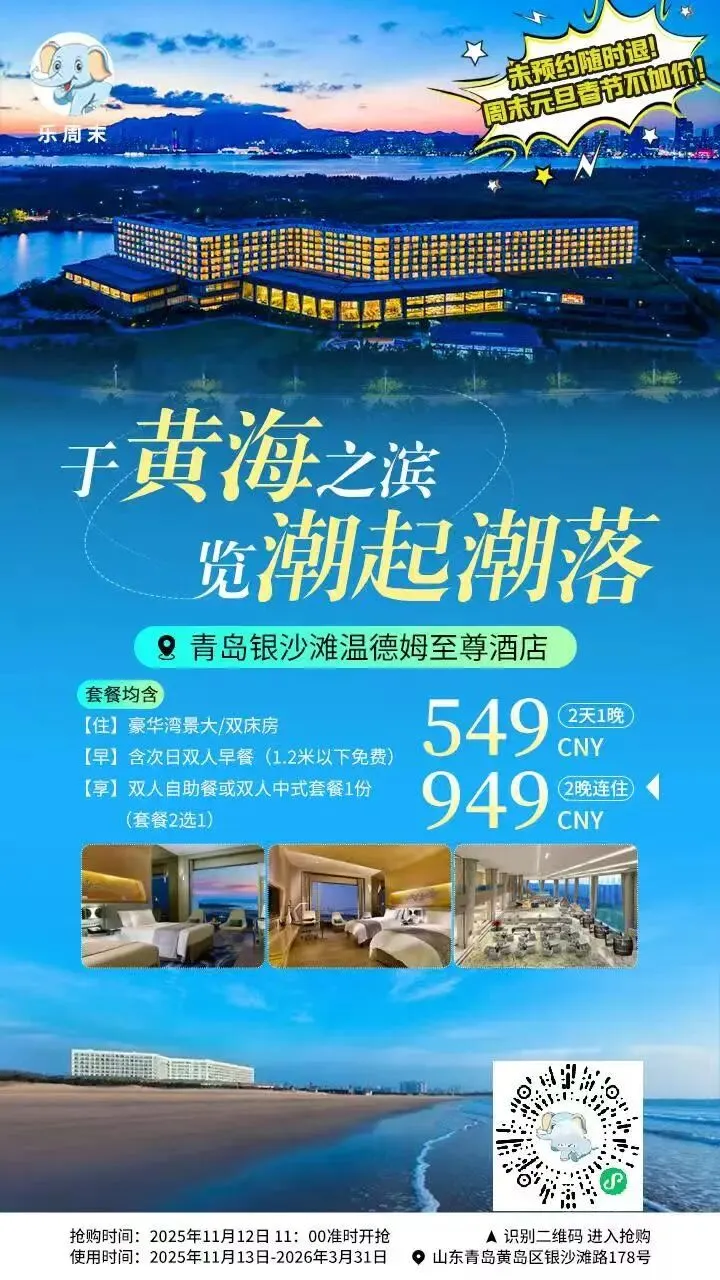 青岛银沙滩温德姆至尊酒店位于青岛黄岛区银沙滩路178号,距银沙滩百米之遥。这里海蓝滩平、沙细如粉、色泽如金、水天一色,是大北方不可多得的海滨度假之选,惬意小资得没有边际。