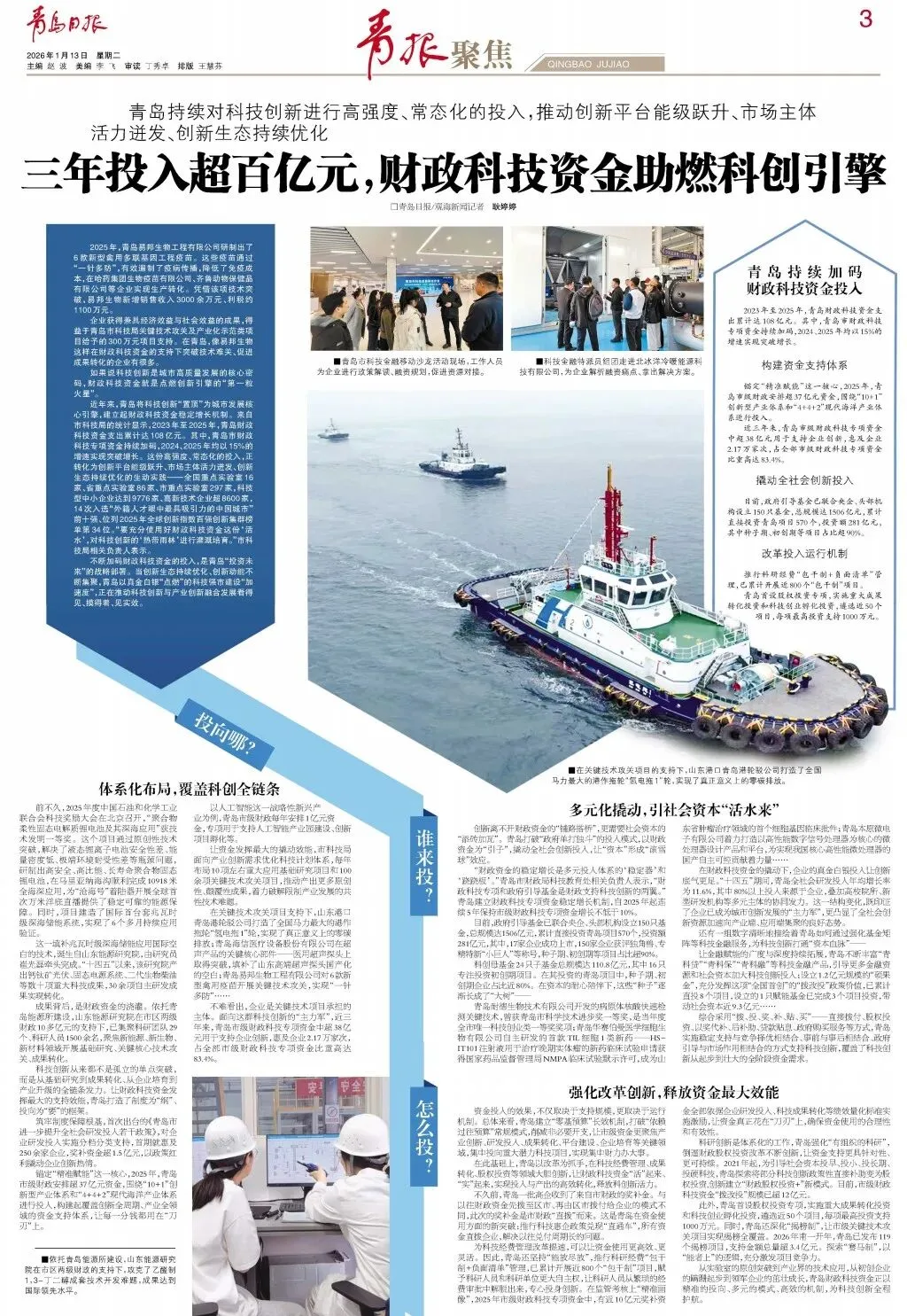 不断加码财政科技资金的投入,是青岛“投资未来”的战略部署。当创新生态持续优化、创新动能不断集聚,青岛以真金白银“点燃”的科技强市建设“加速度”,正在推动科技创新与产业创新融合发展看得见、摸得着、见实效。