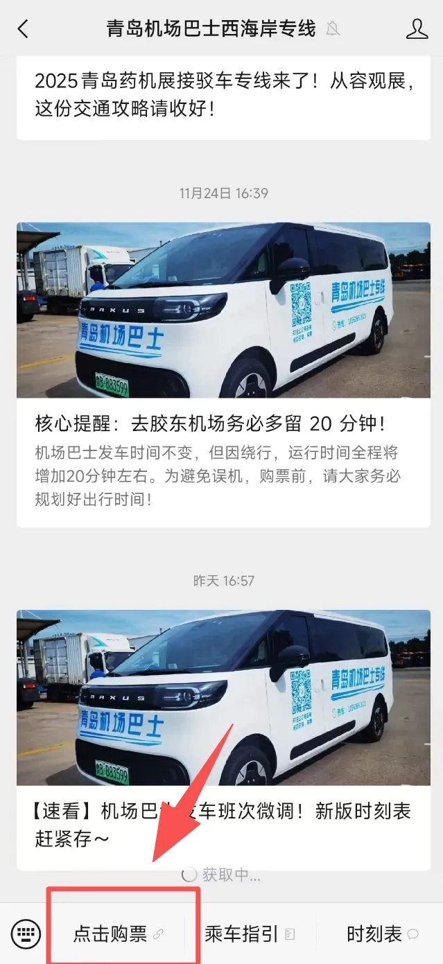 进入“青岛机场巴士西海岸专线”微信公众号,点击菜单栏“点击购票”即可进行购票