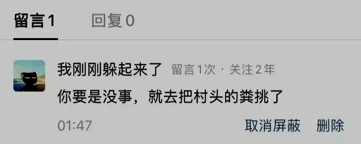 忽然发觉有一条被平台屏蔽的留言,是网名“我刚刚躲起来了”于凌晨1:47发出的——你要是没事,就去把村头的粪挑了
