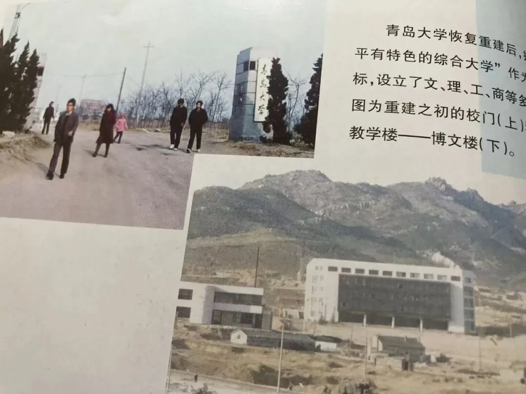 目前广为流传的一枚青岛大学老照片,是当年的31路车掉头西行的临时站点上面的校门口。顺着上坡东行,再穿过供热站,可去往师专、纺织干校,与大门口在湛流干路的纺院连成一片。青岛大学校牌的背后,是一条树林间的斜行路径。穿行过后、跨过土路,可见最早启用的综合教学楼。
