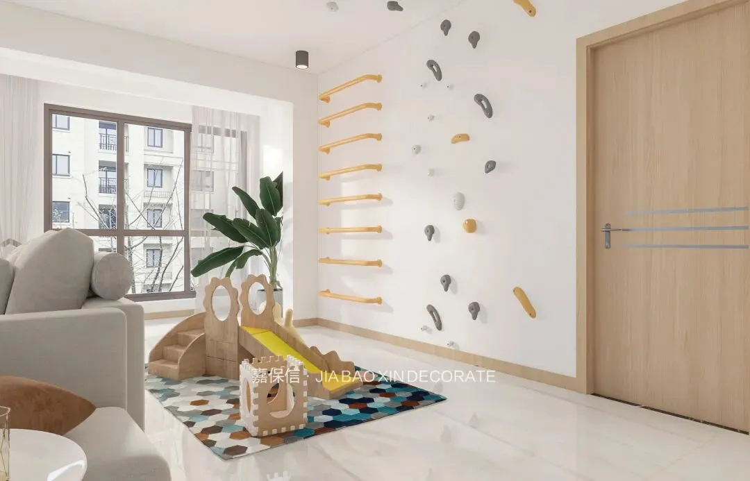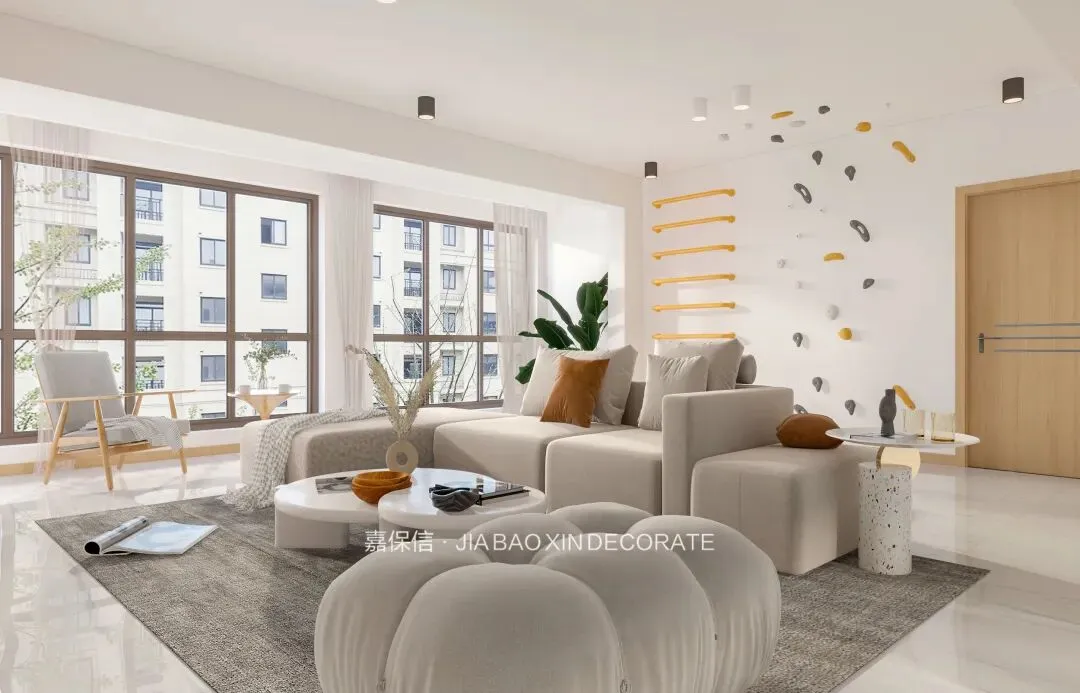 客厅以白墙与浅木色踢脚线为衬,灰调地砖和软装晕染出温柔静谧的氛围。沙发墙融入攀岩元素与亮橙色横杆,既能攀爬玩乐,也成为客厅的点睛之笔。松软的灰色沙发搭配白色茶几、黑色地毯,围合出可躺平的慵懒角落。景观窗把阳光与城市景观引入室内,成为室内装饰的一部分。