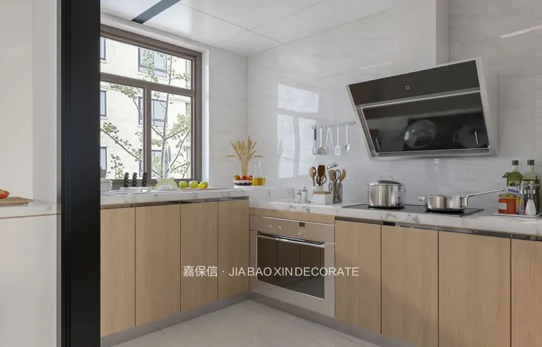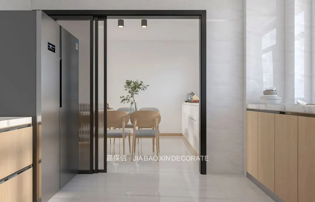 厨房以灰调大理石墙砖搭配白色台面,质感高级又好打理。厨电无缝嵌入浅木色橱柜,柜面干净利落。亮面地砖铺就流畅的洄游动线,光源藏进吊顶,让夜晚的照明柔和又均匀。长虹玻璃推拉门开合灵活,轻松隔开日常的烟火气。