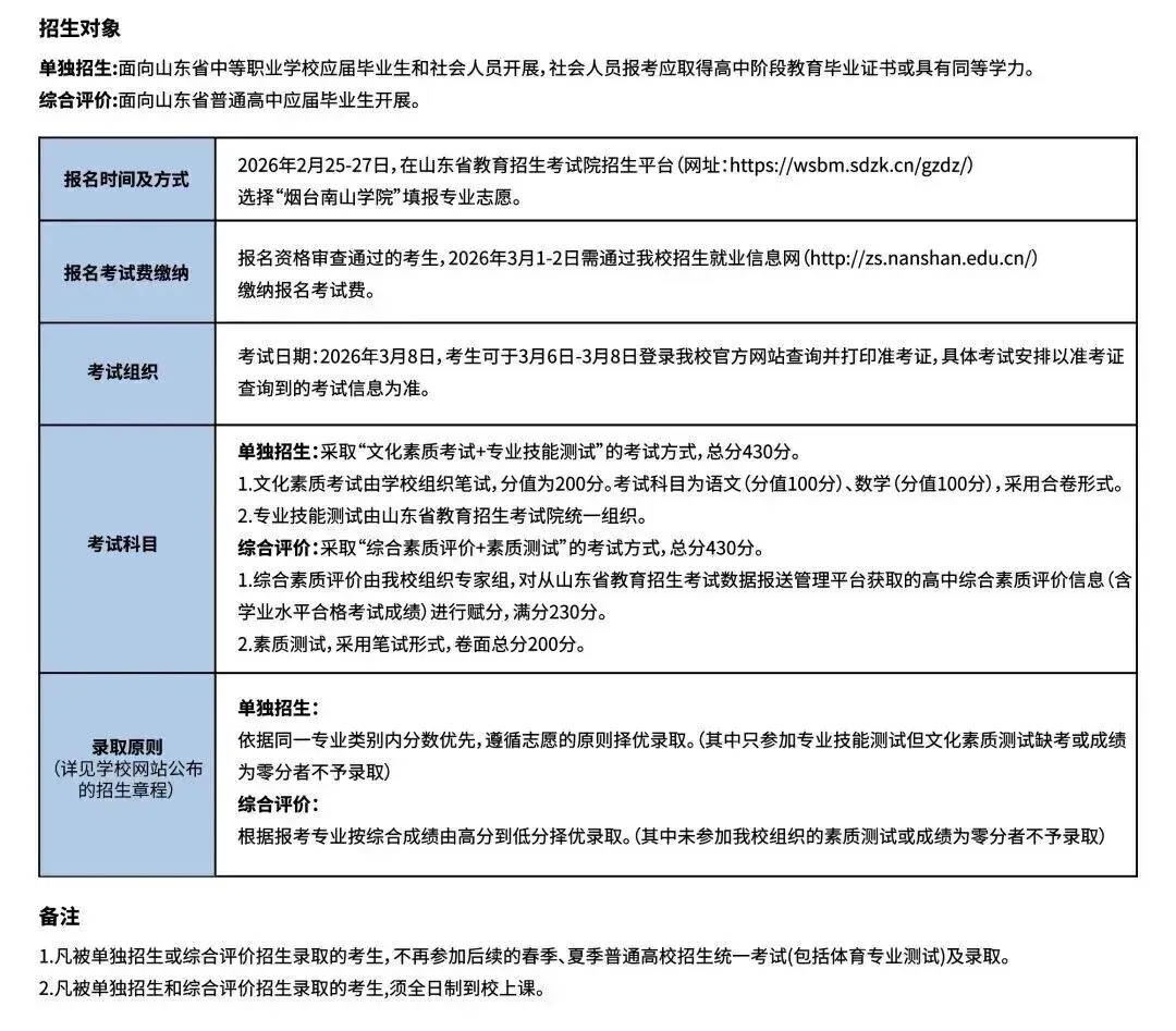 >烟台南山学院 | 2026单招考试内容