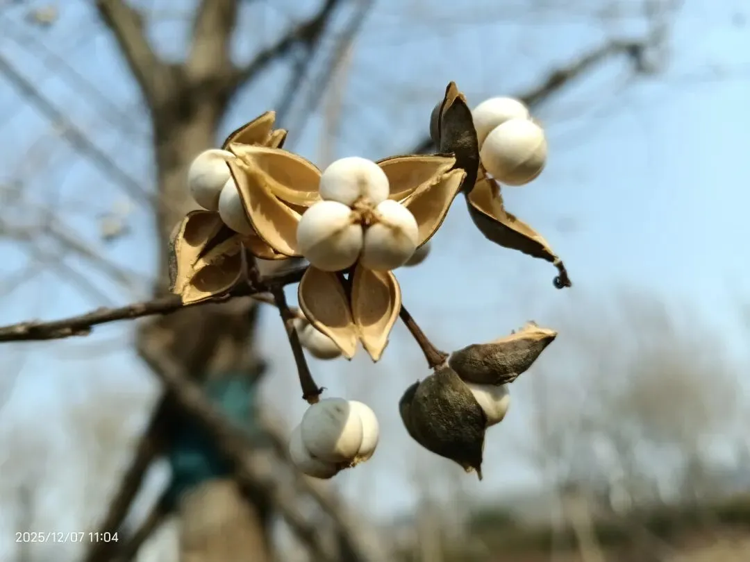 虽然是新栽的,树上却有不少裂开的果子。果子裂开后,露出白白的种子。