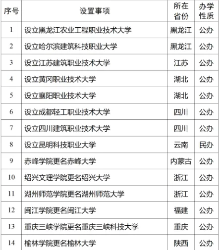 教育部发布《关于拟同意设置本科高等学校的公示》,拟同意设置黑龙江农业工程职业技术大学等14所本科高等学校。