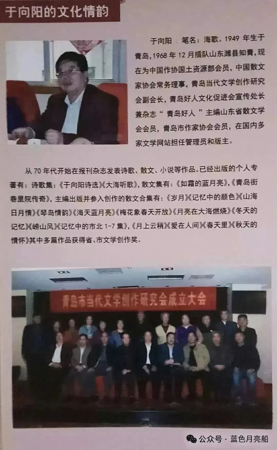 编者按:《蓝色月亮船》是青岛新闻网蓝月亮文学社载满已经正式出版成书的蓝月亮文学,《记忆中市北1——15集》,《蓝月亮文丛》20部《于向阳的文集:诗歌集、大海听歌,散文集、小说集、文史集、童话集》10部、约40多部作品、4000多篇文章。本篇文章是青岛文史家张润东先生的来稿,感谢大家的欣赏支持!