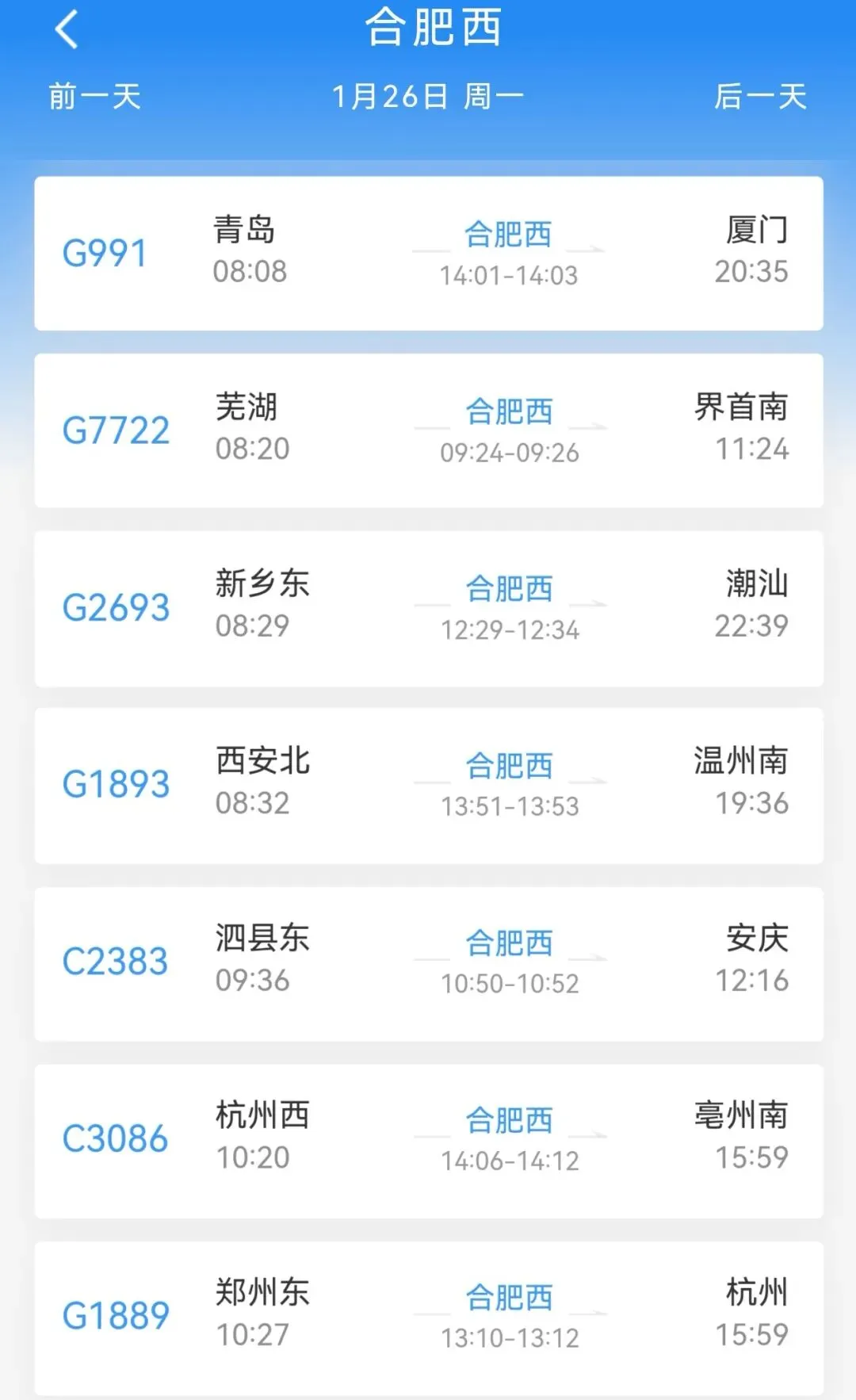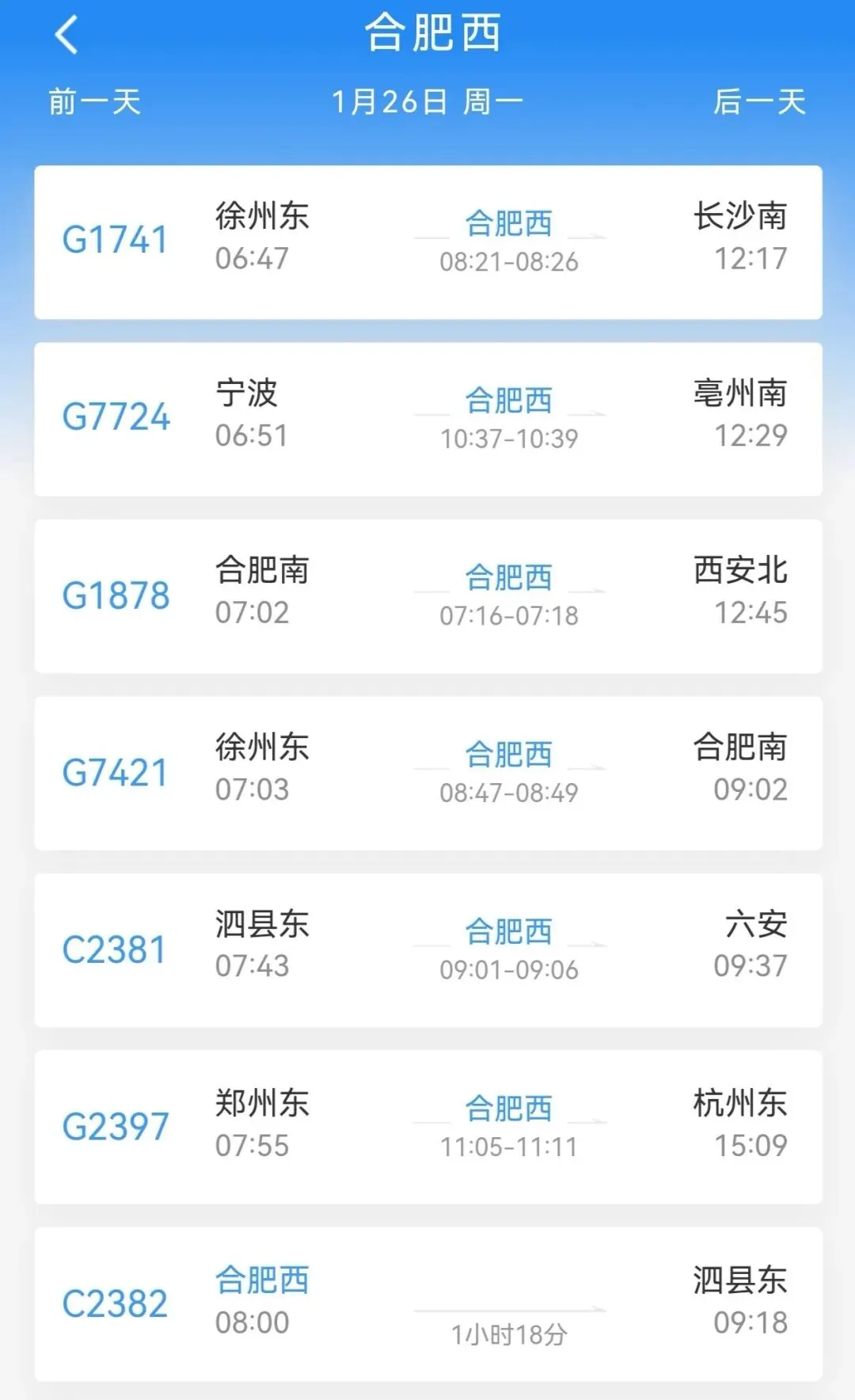 在铁路12306App时刻表中选择“合肥西”,1月26日共查询到29趟列车,1月27日共查询到30趟列车。