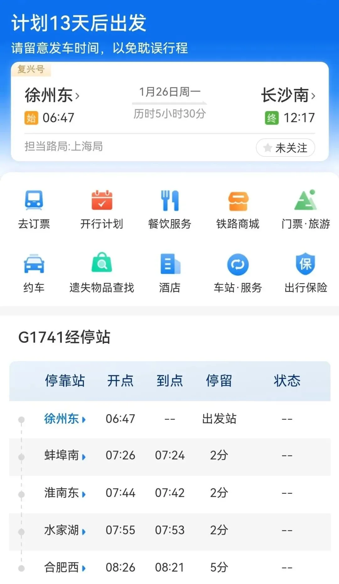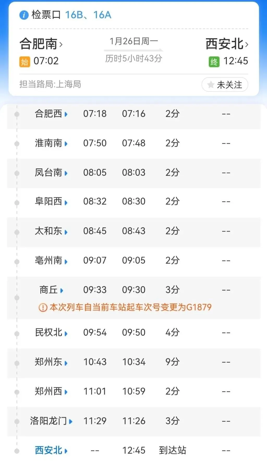 G1878/G1879次从合肥南7:02分始发,14分钟后到达合肥西站,经过淮南南、凤台南、阜阳西、太和东、亳州南、商丘、郑州东、洛阳龙门等地,于12:45分终到西安北。