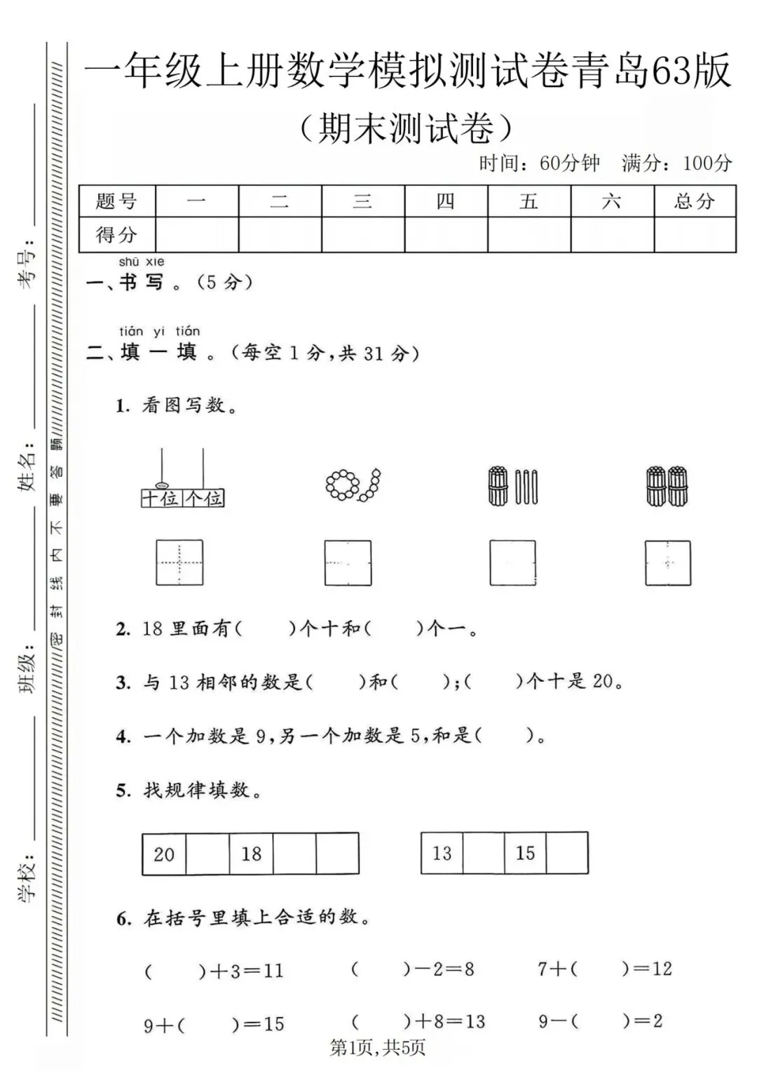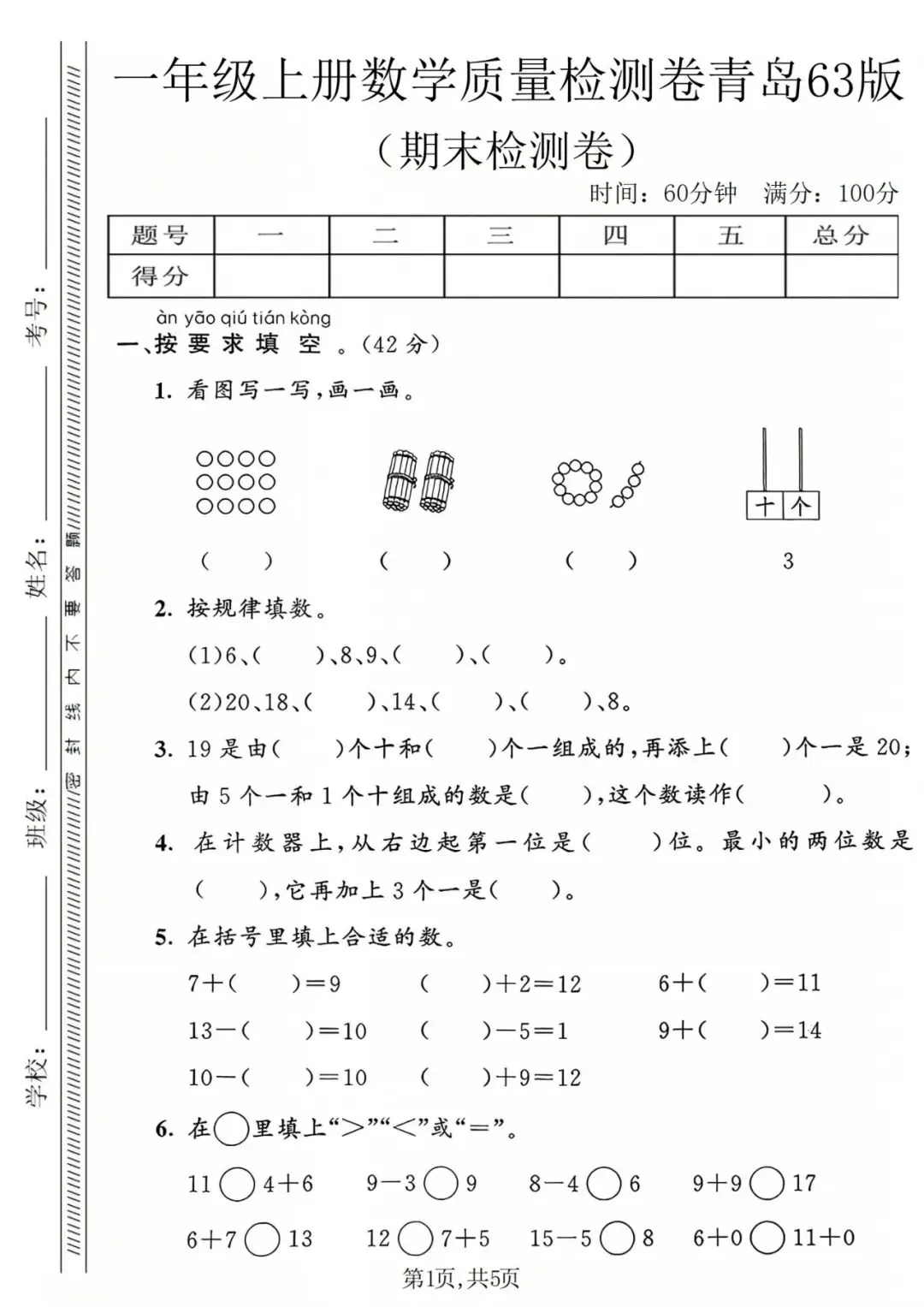 2025年青岛版一年级数学上册《期末测试卷》(附答案)。核心知识牢牢掌握~爸爸妈妈快点打印出来,让孩子练一练吧。