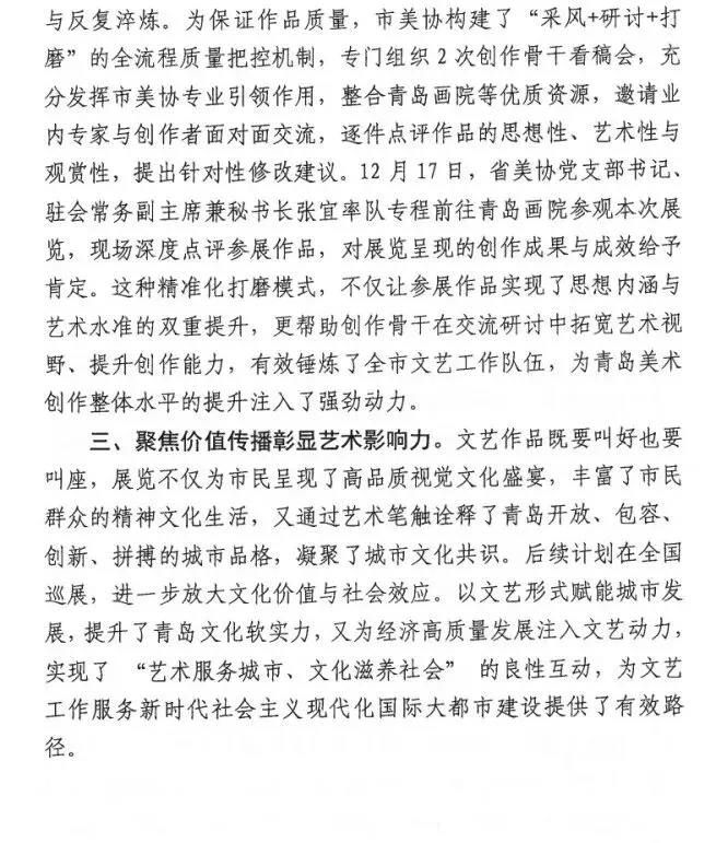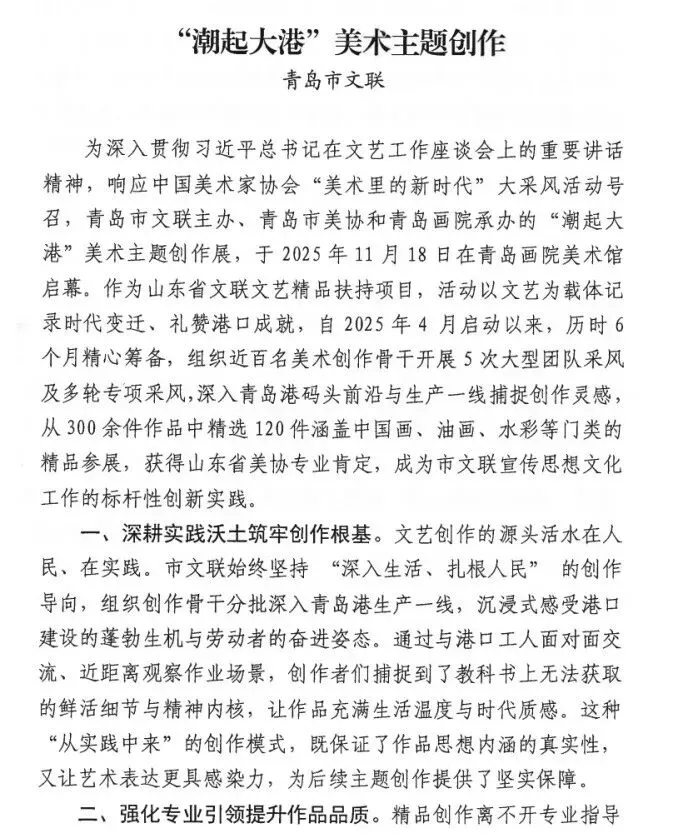 “深入生活、扎根人民”是文艺创作的核心路径,也是文艺文联工作的重要抓手。2025 年以来,全省文联系统坚持以习近平新时代中国特色社会主义思想为指导,全面贯彻落实党的二十大和二十届历次全会精神,深入学习贯彻习近平文化思想,坚定扛牢“走在前、挑大梁”的使命担当,充分发挥文联组织“两个优势”,聚焦创作生产优秀作品这一中心环节,深入生活、扎根人民,推出了一批亮点突出的优秀创作成果,青岛市“潮起大港”美术主题创作项目被省文联评为优秀典型案例。