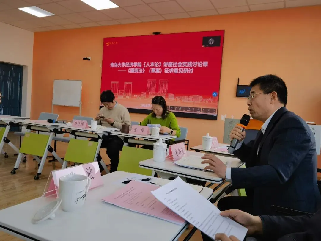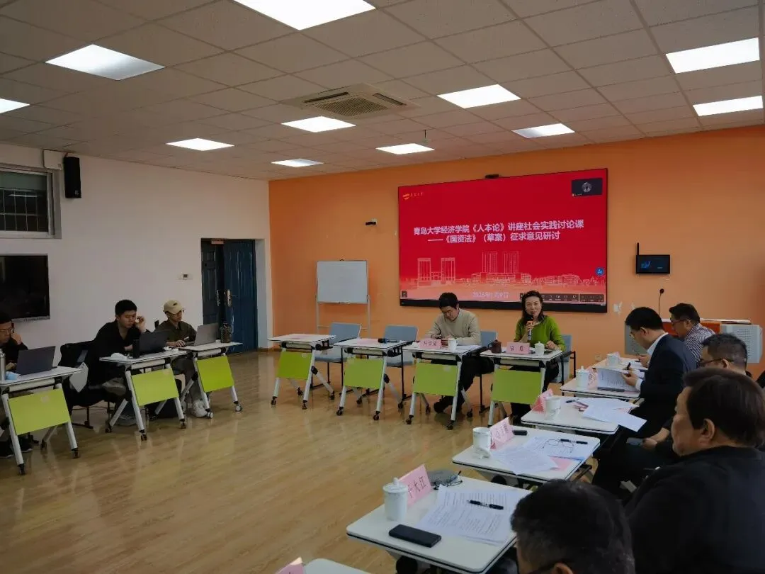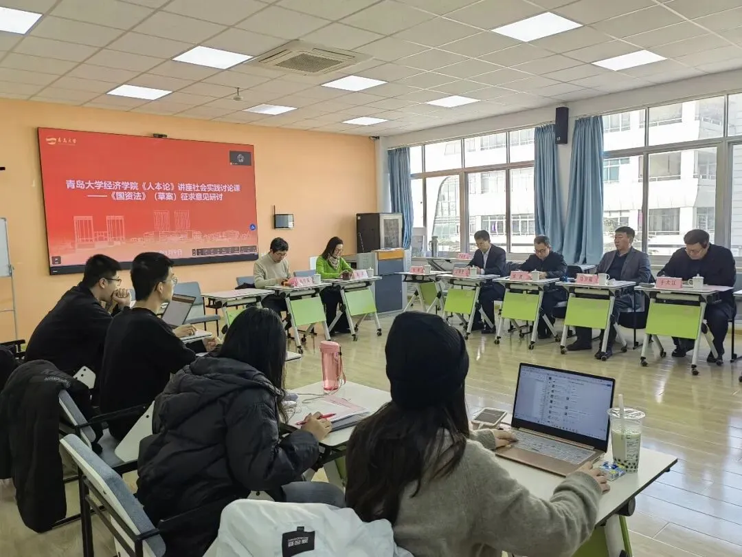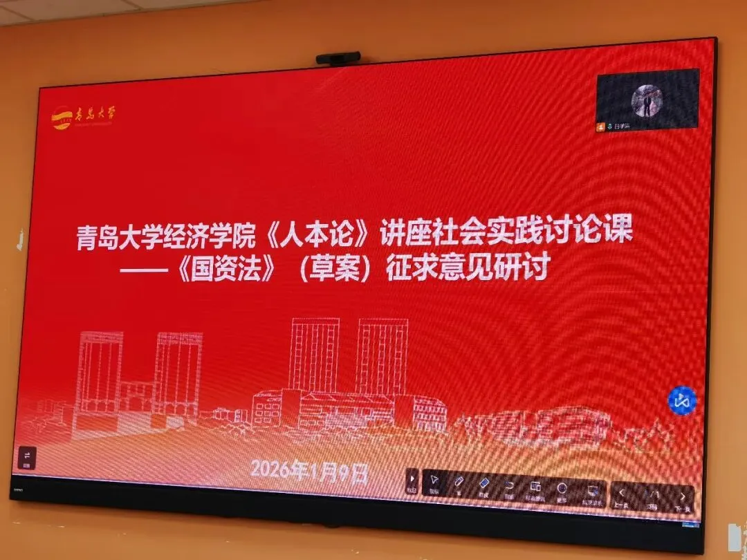 2025年12月27日全国人大常委会网站发布《国有资产法草案》面向社会公开征求意见,青岛大学经济学院2026年1月9日下午在3号实验楼423教室举办《人本论》讲座社会实践专题讨论课。在青岛大学经济学院院长吕学梁教授主持下,组织2024级理论经济学研究生研讨《国资法》修立草案征求意见稿,邀请青岛市国资委原主任、青岛国际投资有限公司原董事长、青岛大学经济学院《人本论》讲座社会实践导师于大江,青岛市人大常委会法制工作委员会副主任张波、青岛市人大常委会预算工作委员会委副主任、市国资委原一级调研员崔竹,青岛市国资委一级调研员、原法规监督处处长姜海光,黄岛区人大常委会全国立法调研联系点负责人赵中宇等专家学者到会指导。青岛大学经济学院《人本论》讲座课堂教学导师常璟副教授现场指导。