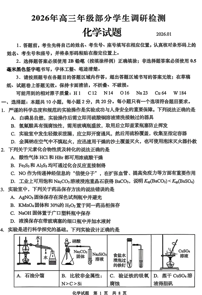 青岛市期末2026年1月高三部分学生调研检测及参考答案,网盘免费分享【可下载pdf版】