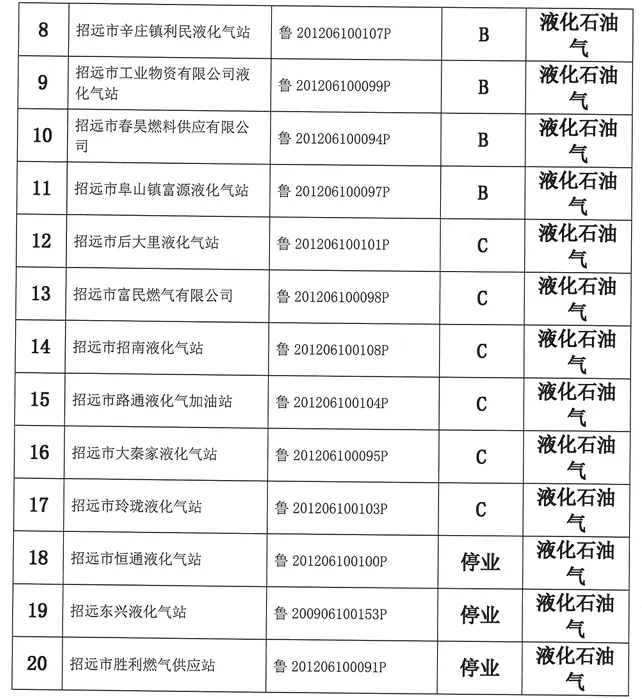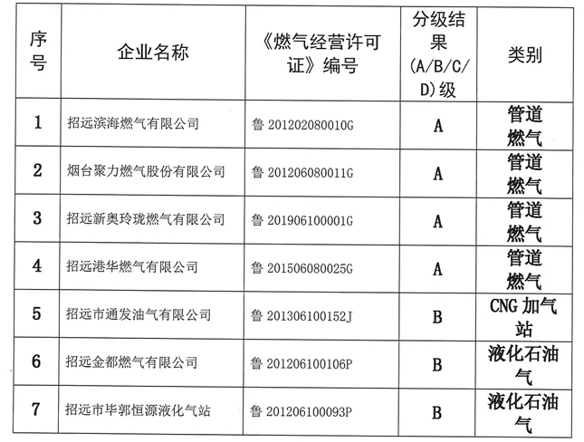 附:招远市城镇燃气经营企业安全生产分级评价部分名单(2024年公布)