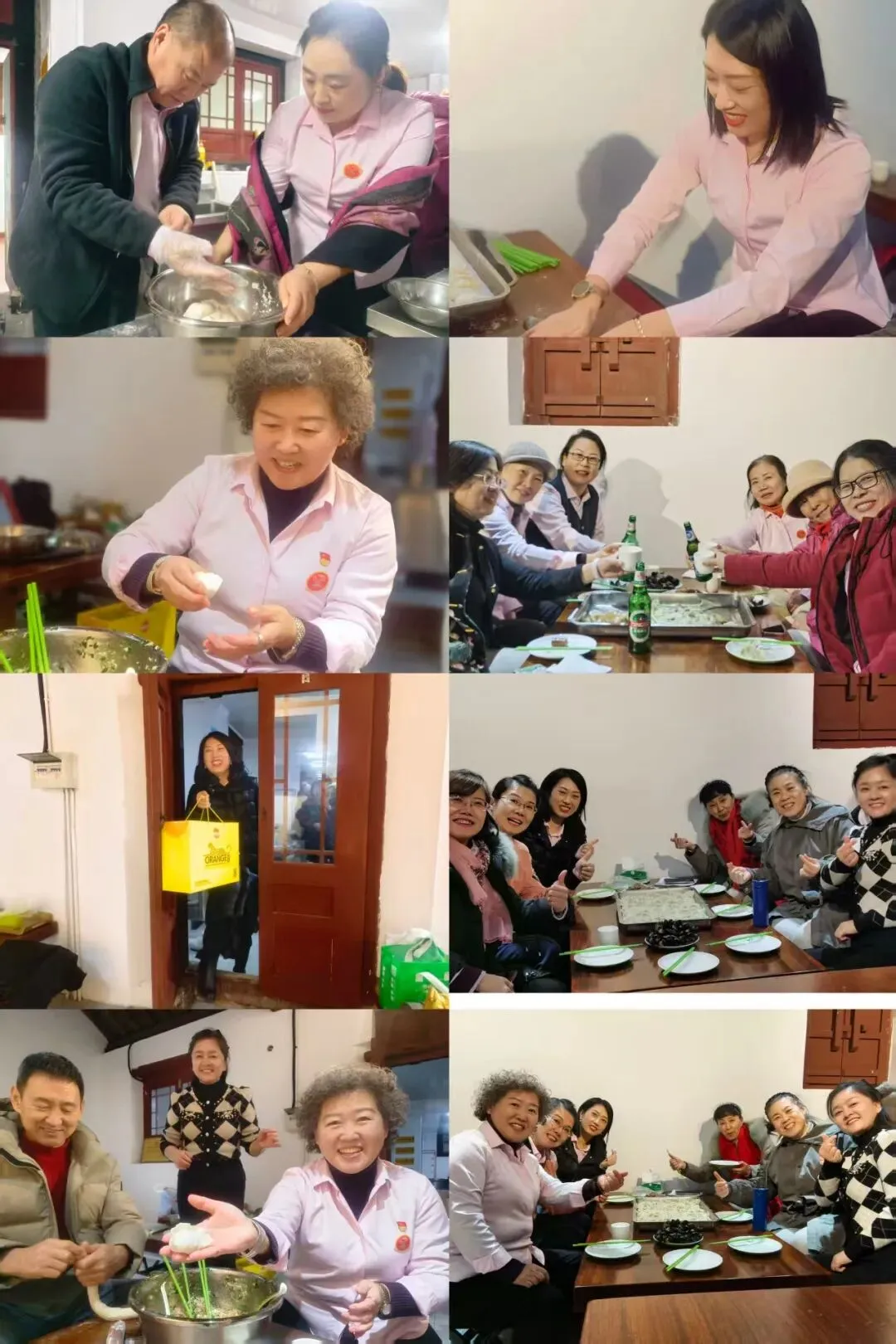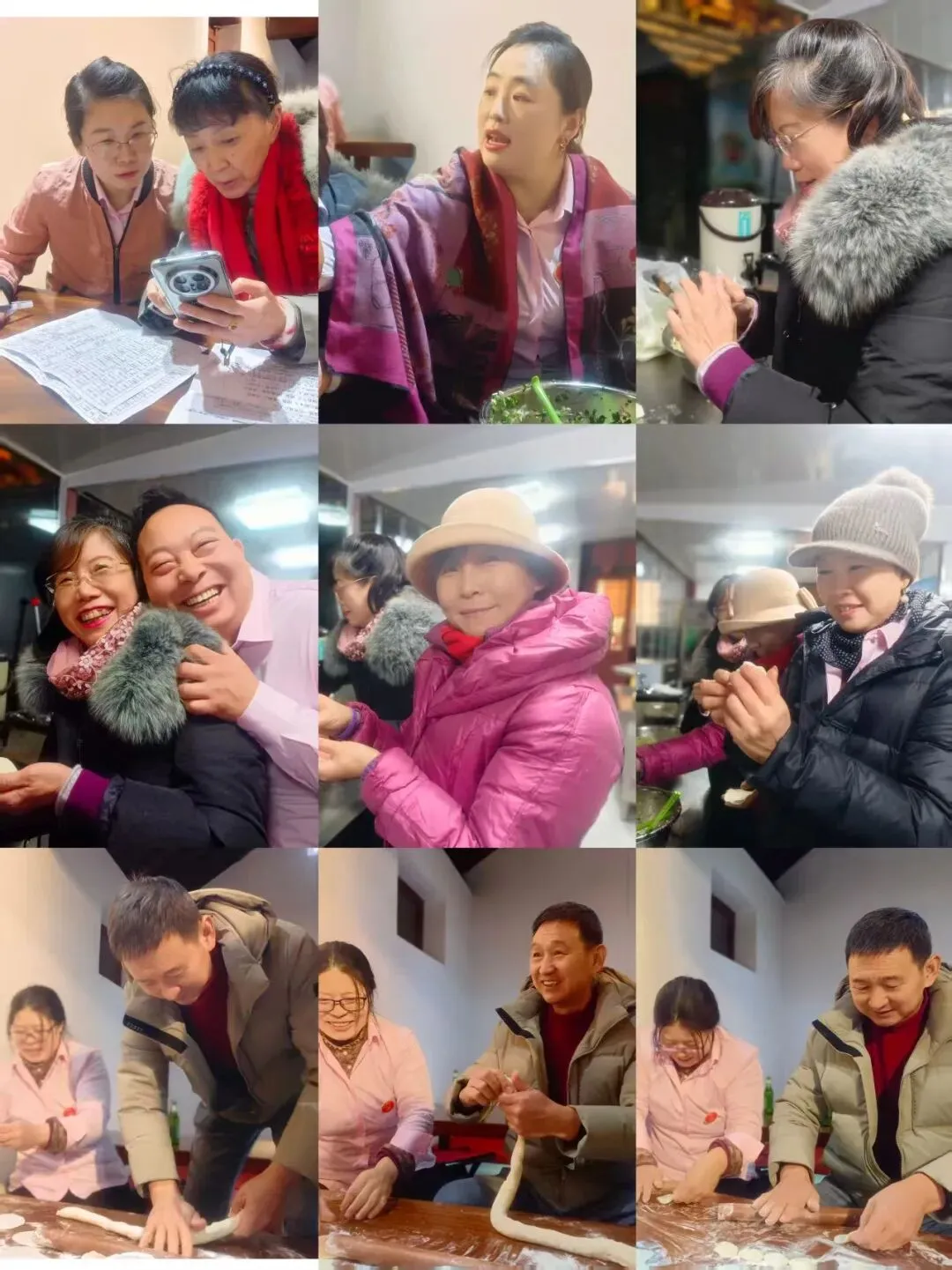 这一天的忙碌并不止于此。陶卫平与郝萍上午还支援了其他公益活动,午后一点半又赶到芝罘区社会组织创益园,为团队年会排练舞蹈两个多小时。郝萍紧接着参加葫芦丝练习,五点下课才匆匆回家休整,随即再次赶往团建现场,与李小云碰头商讨年会细节——她的这一天,可谓在公益路上步履不停。陶卫平舞蹈排练结束后先送老师回家,亦未多歇,便端起相机,为这场团聚记录珍贵瞬间。刘爱华与张海燕,同样从下午一点半到五点连续排练舞蹈与葫芦丝,未作停歇便径直赶来,挽起衣袖加入包饺子的行列。