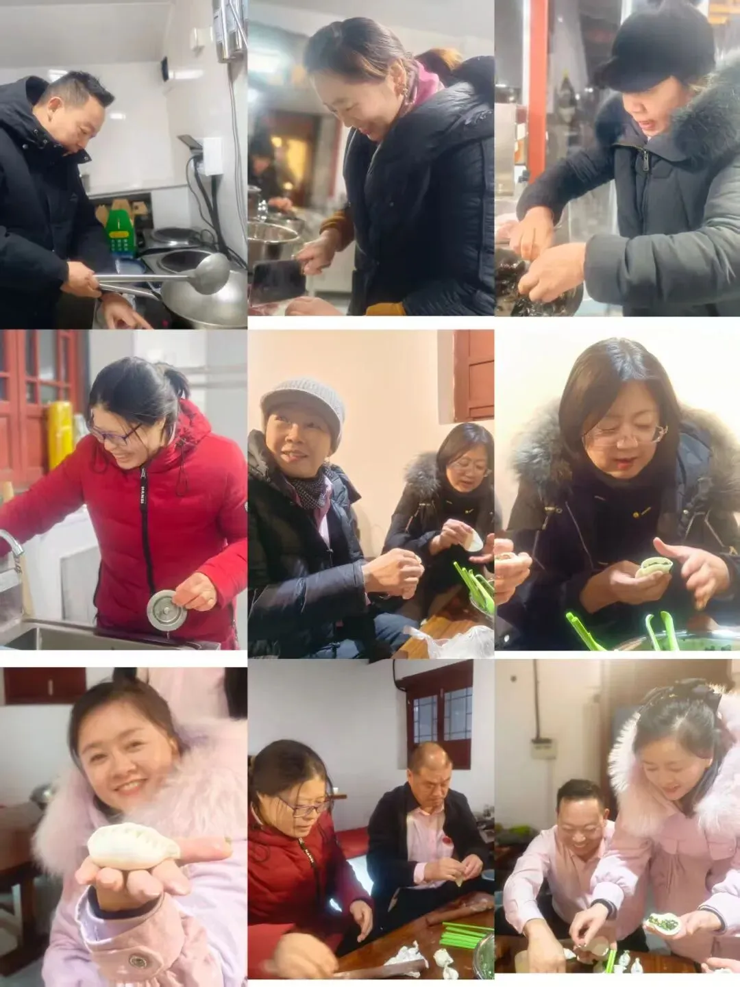 于大勇团长早已备好食材:白菜、猪肉、韭菜、鸡蛋、木耳、海虹,连同现成的饺子皮,静候大家的到来。于娟最先抵达,与团长一同忙起了准备工作。随后,执行团长刘美香,张慢慢、张蓉、张翠珍等陆续推门而入。很快,店里便热闹起来:洗菜、摘海虹、剁馅、调味、擀皮,各司其职,笑语盈堂,仿佛一个大家庭亲人的冬日团聚。