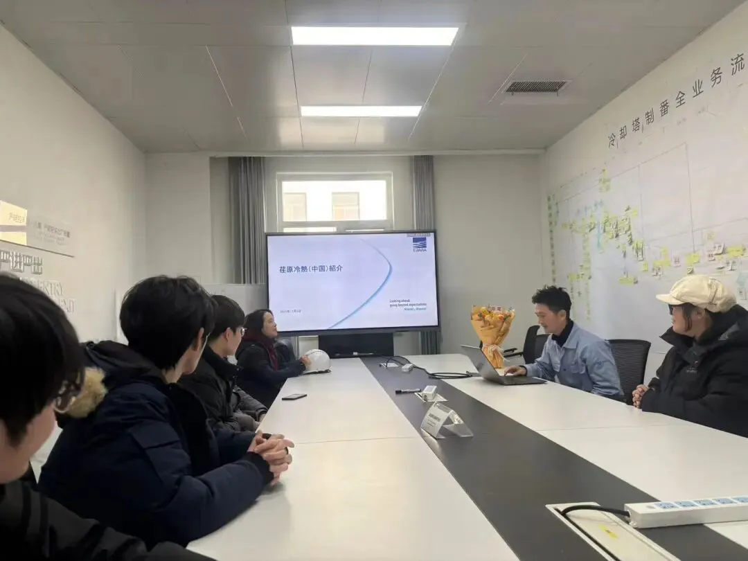 活动中,荏原冷冻日方技术开发部长北村先生热情接待了师生一行,通过生动案例与详实数据,全面分享了企业的全球发展战略、核心业务布局及技术创新成果。重点介绍了冷却塔产品在工业生产、绿色建筑等领域的核心应用,以及企业深耕中国市场、辐射海外的运营逻辑。随后,师生们深入生产一线,实地观摩了产品从零部件加工到成品检测的全流程,整洁规范的生产环境、智能化的作业设备与精细化的管理标准,让同学们直观感受到日式管理“严谨高效、追求极致”的精髓。现场,同学们围绕日语职场应用、跨国沟通技巧等问题积极提问,北村先生及企业员工逐一细致解答,互动交流氛围热烈。