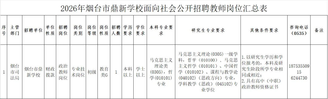 报名采取统一时间报名、初审的方式进行。应聘人员有扰乱报名秩序、伪造学历证明及其他有关证件骗取考试资格等行为的,查实后取消其本次报名资格。报名时间:2026年1月19日9:00-1月23日16:00报名电子邮箱:yantaishidxxx@163.com应聘人员报名前,请仔细阅读本招聘公告,确认符合拟应聘岗位的条件后再进行报名。对应聘岗位条件中的专业、学历、学位、回避情形、资格条件、工作经历等信息需要咨询时,应聘人员直接与市鼎新学校联系,咨询电话可在岗位汇总表中查询。应聘人员下载填写《烟台市鼎新学校公开招聘教师报名登记表》(附件2),登记表中照片要求为本人近期一寸免冠正面照片,照片应保证清晰可辨,并在规定时间内发送至指定报名电子邮箱进行审核,邮件主题须为“考生***(姓名)应聘***(应聘岗位)报名登记”。报名必须使用有效身份证件,报名与考试时使用的身份证件必须一致。应聘人员姓名、身份证号码等个人信息必须真实一致。报名登记信息一经资格初审通过,不能更改。1月23日16:00后发送的报名信息为无效报名(以报名电子邮箱收到报名邮件时间为准)。初审时间:2026年1月19日9:00-1月23日17:00市鼎新学校在指定报名期间安排专人负责查看报名情况,确定符合聘用条件的人员,并对资格审查结果负责。根据应聘人员提交的信息资料,对应聘人员进行资格初审,报名期间每天下午16:00汇总当天的报名资格初审结果,18:00前向发送《烟台市鼎新学校公开招聘教师报名登记表》的电子邮箱反馈初审结果,并在市司法局网站公布审核通过专业,当天下午16:00后报名的资格初审结果与次日下午16:00前报名的资格初审结果一同反馈。基于应聘人员网上填报信息,对具备报名资格并符合应聘条件的,不得拒绝报名;对不符合应聘条件而未通过初审的人员,要说明理由;对提交材料不全的,应注明缺少的内容,并退回应聘人员补充。报名期间,市鼎新学校安排专人接听咨询电话,提供咨询服务。应聘人员可在提交(修改)报考信息当天下午18:00后,登录个人电子邮箱查询报名资格初审结果,登录市司法局网站查看审核通过专业。请应聘人员务必及时查询资格初审结果,未接到反馈邮件的务必在1月23日17:00前电话联系确认情况,防止遗漏。如有疑问,请主动联系市鼎新学校。市鼎新学校和市司法局留存通过资格初审人员的报名信息,供资格审查时参考。应聘人员对报名初审结果持有异议,可在1月24日11:00前向指定的报名期间复核电话反映,不在规定期限内反映,视为对初审结果无异议。本次考试免收考试费。对应聘人员的资格审查工作,贯穿招聘工作的全过程,网上初审结果不作为确定符合应聘条件的最终依据。凡在后续工作中发现初审通过人员不符合应聘资格或弄虚作假等问题的,一经查实,立即取消考试、聘用资格。现场资格审查时间、地点在烟台市司法局网站另行公布。2.提交材料。现场资格审查提供下列材料的原件及复印件,考生须提前按下列顺序装订好复印件,原件核对后归还:(4)学位、学历证书。普通高校2026年应届毕业生提供毕业生就业推荐表,海归留学人员须提供国务院学位委员会和教育部授权教育部留学服务中心出具的国(境)外学历学位认证书。(5)在职或已签署就业协议的,须提供具有人事管理权限部门或单位出具的解约证明或单位同意报考证明。(7)招聘岗位有“研究方向”(附件1“专业要求”栏中专业后面有括号的,括号内的内容即为专业研究方向要求)要求的,提供学习成绩表复印件和专业研究方向证明(由高校教务部门或研究生处(院)出具并加盖公章;全日制普通高校2026年应届毕业生《就业推荐表》标明专业研究方向的,可作为专业研究方向证明)。(8)招聘岗位“其他条件要求”栏有资格、资质等要求的,还须提供相关的证书及佐证材料等。3.有关要求。现场资格审查须本人到场,不得委托他人。现场资格审查材料不全的,须在资格审查次日17:00前提交;单位同意报考证明信或解约函(证明)因故不能在面试前现场资格审查时提供的,也可在考试结束(不含考试当天)后第5个工作日17:00前提供。应聘人员未在规定时间参加现场资格审查或未在规定时间内提交指定材料,均视为弃权。经审查不具备报考条件的,取消其考试资格。资格审查通过人员领取准考证,资格审查后考试(包括面试、笔试)、签约等有关事项通知均在烟台市司法局网站发布。现场资格审查结束后,审查通过人数与招聘计划人数达不到3:1比例,取消招聘岗位。取消招聘岗位的情况,在烟台市司法局网站公布。三、文章来源