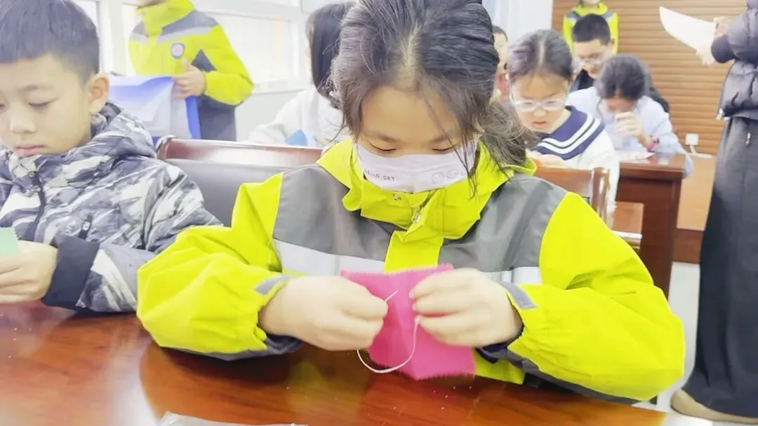 赛场之上,一派热火朝天的景象。三年级的“图书美容师”们手持书皮,量尺寸、裁边角、粘封面,动作有条不紊,朴素的课本很快穿上了整洁的“新衣”;四年级的“和面小达人”们围站桌前,加水、揉面、塑形,面粉飞扬间,一个个光滑的面团新鲜出炉,满是成就感;五年级的“缝纫小能手”们则挑战穿针引线,打结、缝补、固定,一颗颗纽扣在布片上稳稳安家,专注的神情格外动人。