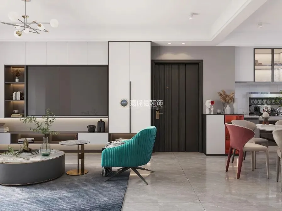 走进客厅,迎面是定制的悬空电视柜,开放格错落其间,轻盈又不失层次。吊灯与筒灯交织出温柔光影,在黑白灰主调中,湖蓝色单人椅与红色餐椅跃然眼前,用色彩点亮空间。