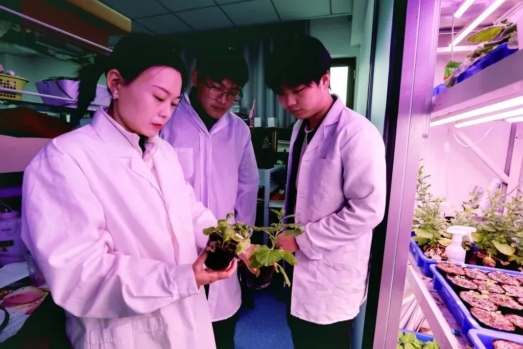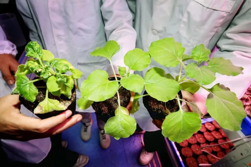 团队在作为模式植物烟草植株上进行实验。(左一为病毒感染植株,左二为接种疫苗抗病毒植株,左三为健康植株。)