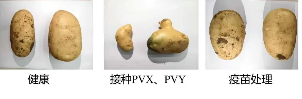 健康马铃薯、接种特定病毒马铃薯与经疫苗处理马铃薯的效果对比。