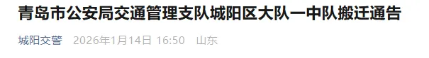 青岛市公安局交通管理支队城阳区大队一中队搬迁通告